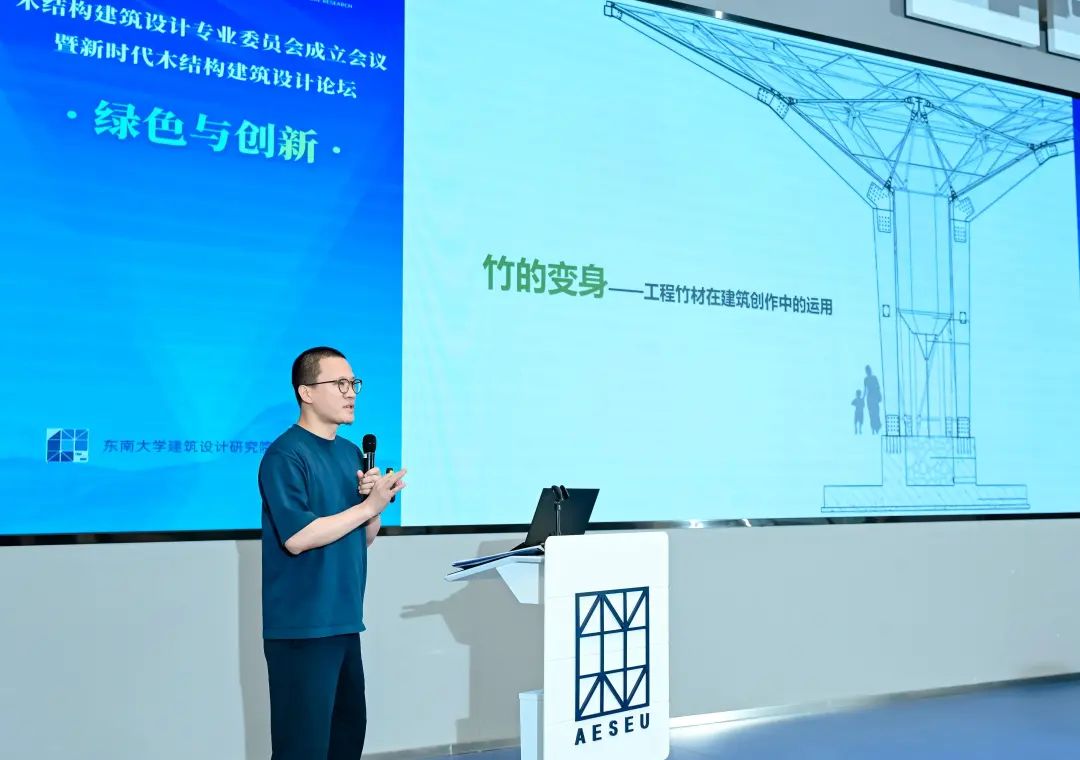 东南大学建筑设计研究院有限公司工作室主任李竹作题为《竹的变身——工程竹材在建筑创作中的运用》的报告,报告介绍了基于工程竹的材料特点开展的系列设计创作实践,阐述工程竹结构在快速建造、低环境扰动等方面的有益尝试。