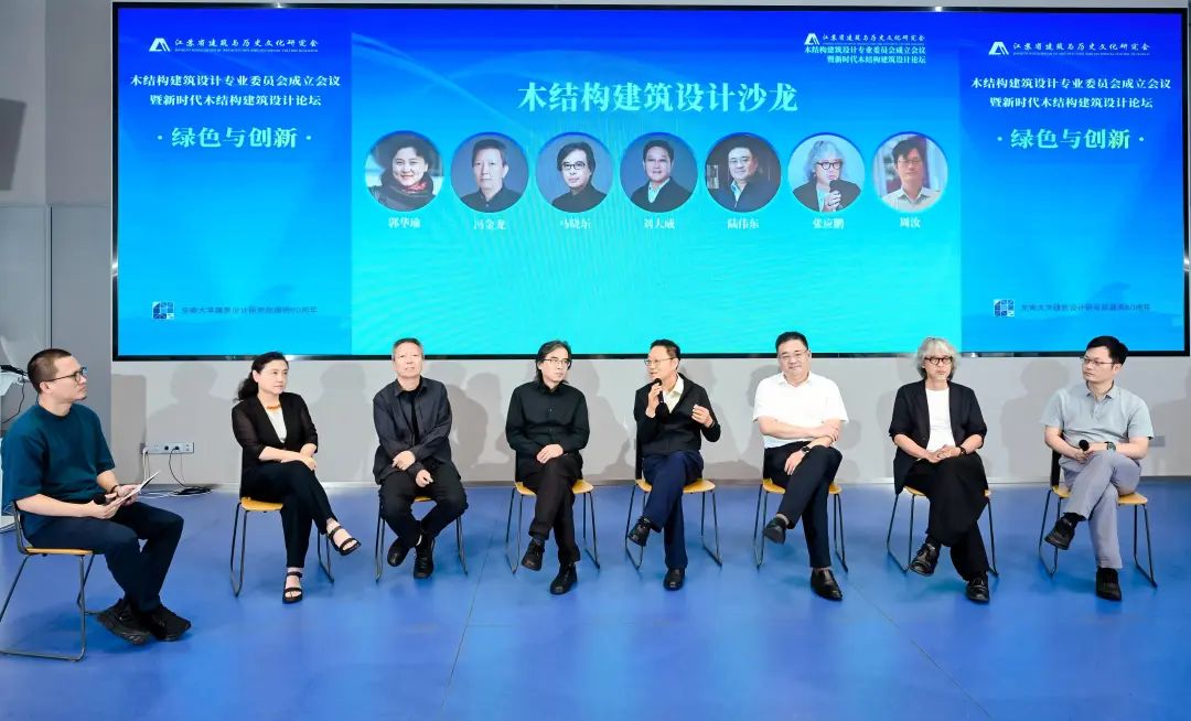 东南大学建筑设计研究院有限公司工作室主任李竹主持木结构建筑设计沙龙,刘大威、陆伟东、马晓东、张应鹏、冯金龙、郭华瑜、周汝等设计、施工、运营等方面的专家和嘉宾,围绕木建构建筑设计主题进行专业研讨和交流。