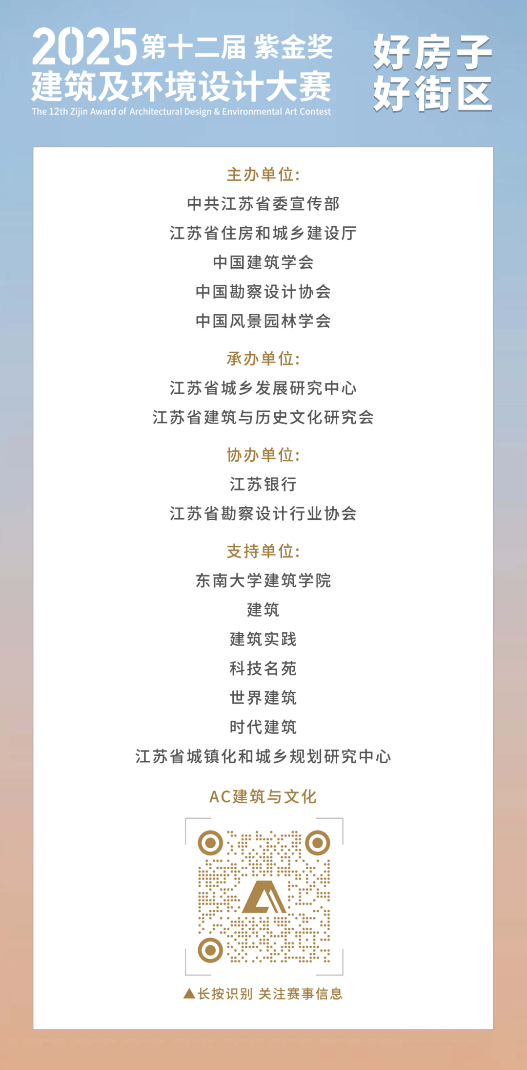 6️⃣ 本届大赛由江苏省城乡发展研究中心、江苏省建筑与历史文化研究会作为承办单位,江苏银行、江苏省勘察设计行业协会作为协办单位,由东南大学建筑学院,建筑、建筑实践、科技名苑、世界建筑、时代建筑,江苏省城镇化和城乡规划研究中心作为支持单位。专项合作赛道合作方为大赛特别支持单位。