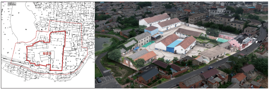 粮管所位于镇区南端,是镇区内最为重要的公共空间之一,总占地面积约15亩,建筑面积约4653.51㎡。地块内7座粮仓建筑建于不同年代,建筑内部空间建筑细节各具特点。