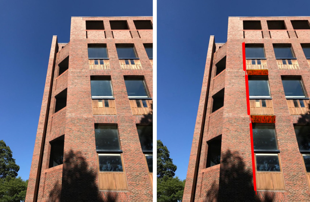 路易斯·康有句著名的发问:“砖,你想成为什么?”而在这个节点,砖表现为平拱。砖不想只是一个饰面材料,它希望自己承受自己的重量。砖平拱的特征就是上口微微比下口大,是结构受力作用的结果。这略微放大的尺寸就体现在了上一个窗户的下口上,以此类推就形成了窗洞口逐渐放大的结果。多么精妙的细节呀!