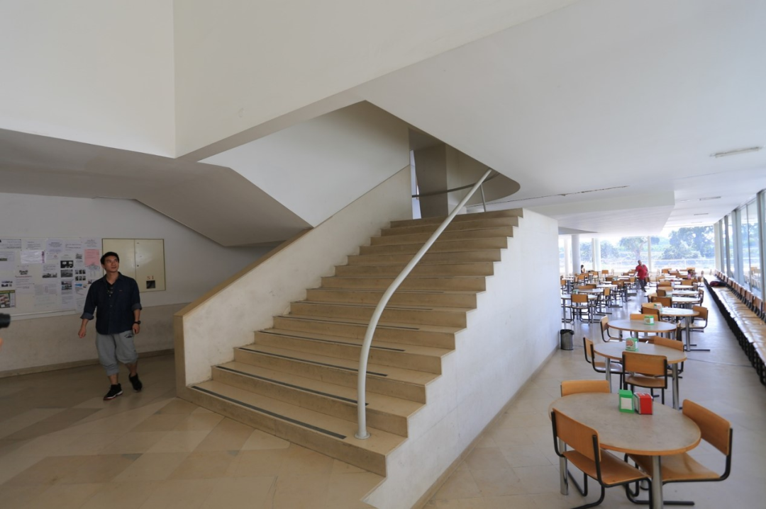 果然一个精彩空间出现了!这半个楼梯平台凸出在下部大的公共空间内。远处的侧窗让楼梯平台有了特别的光线,把人的视线引回到下部餐厅。很显然,这个窗户是为楼梯设计的,它并不需要为餐厅采光。这个半层空间的介入让建筑的垂直交通增加了人文味道。来者并不是蒙头上一层,而是在半层处回望热闹的餐厅,产生特别的观望感受,给予了来者丰富的情绪价值。