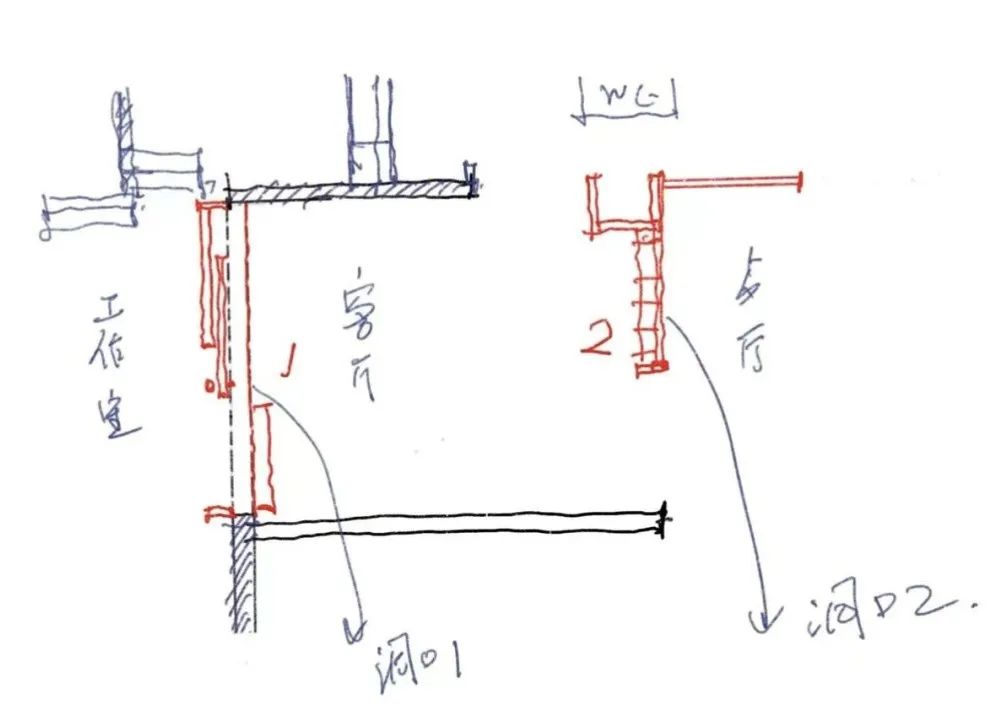 5️⃣ 客厅面的门把手很顽皮地比工作室的界面高一点,升入梁边的空隙中;从客厅一侧看来,门把手和梁有了更紧密的关系。