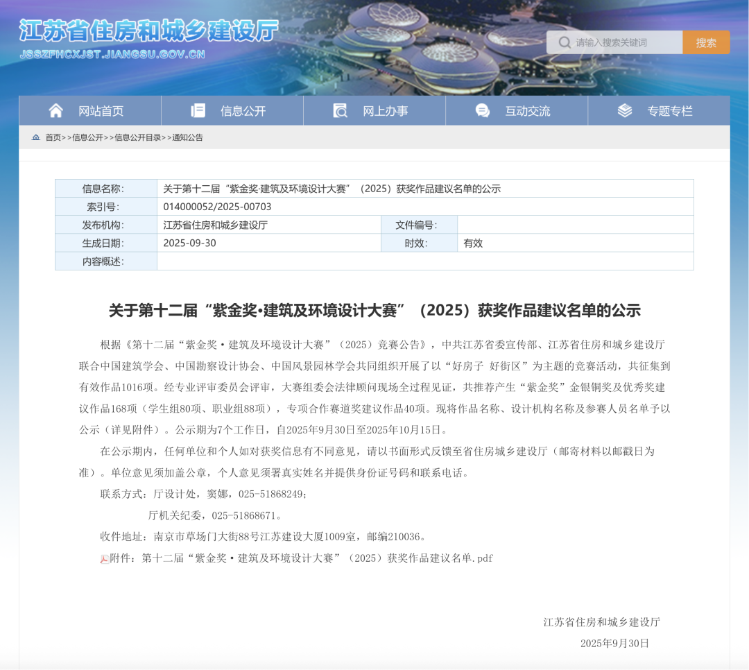 获奖公示 | 第十二届“紫金奖·建筑及环境设计大赛”(2025)获奖作品建议名单公示