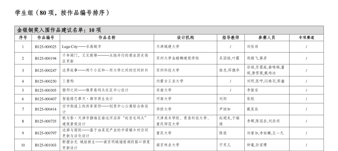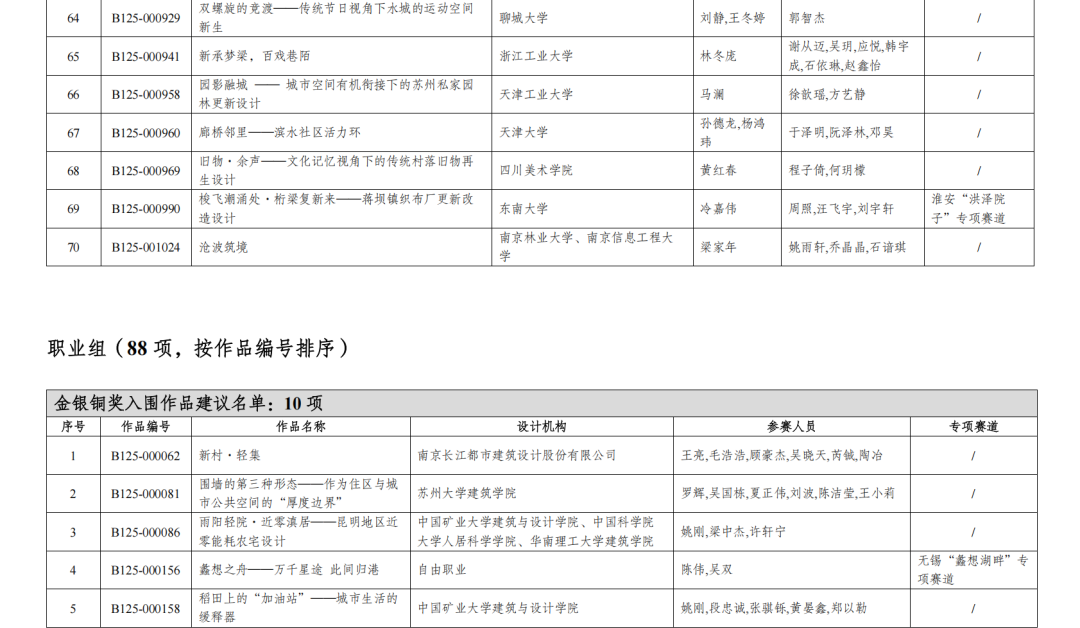 经专业评审委员会评审,大赛组委会法律顾问现场全过程见证,共推荐产生“紫金奖”金银铜奖及优秀奖建议作品168项(学生组80项、职业组88项),专项合作赛道奖建议作品40项。现将作品名称、设计机构名称及参赛人员名单予以公示。公示期为7个工作日,自2025年9月30日至2025年10月15日。