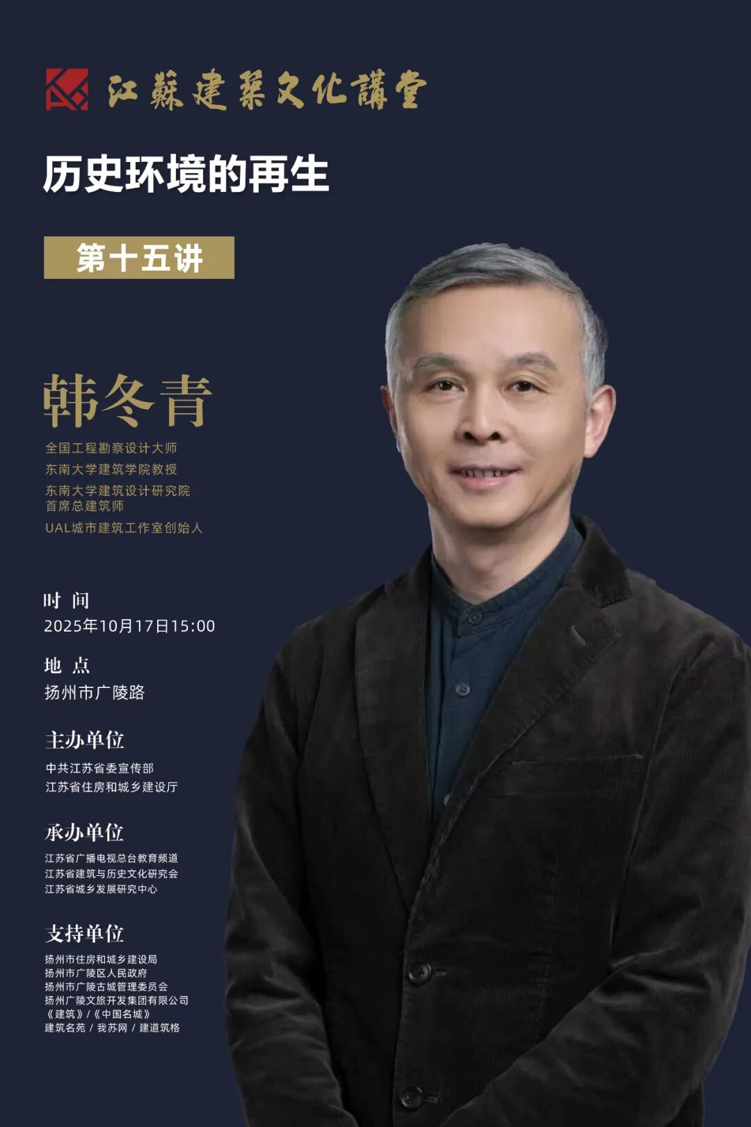 由中共江苏省委宣传部、江苏省住房和城乡建设厅、中国建筑学会联合主办的“江苏·建筑文化讲堂”第十五讲将于10月17日在扬州市举办。本次讲堂由全国工程勘察设计大师韩冬青,作题为《历史环境的再生》的演讲。