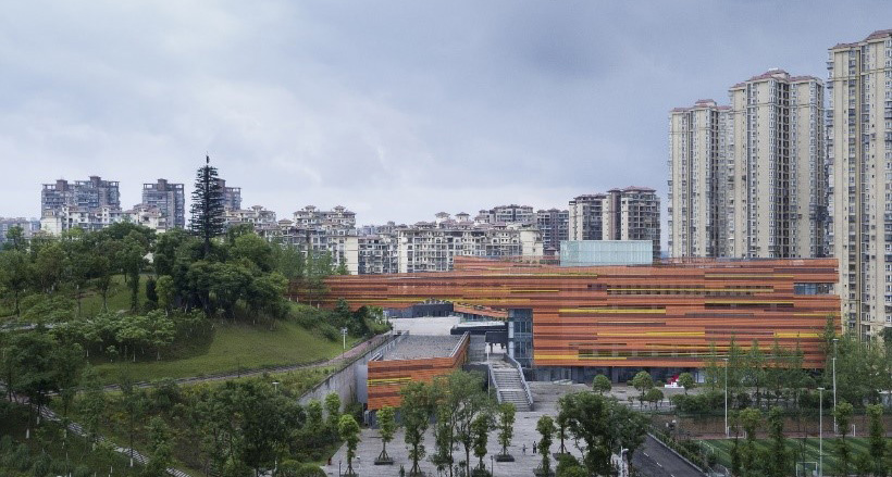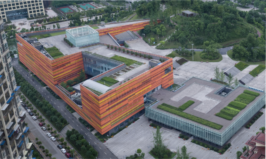 建筑色彩取泸州酒窖五色土的意涵,利用彩色铝制格栅统一建筑形体,体现了泸州甘醇浓烈的文化气质,形成了与泸州人豪放性格相得益彰的地域景观特色。