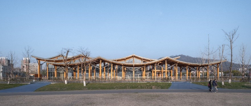 设计采用小体量建筑以呼应山水环境,下沉广场与滨水公园紧密相连;建筑形式汲取自然灵感,采用钢木玻璃相结合的材料,使得室内外空间渗透与融合,并鼓励室外公共活动,实现公共空间与景观环境的一体化。