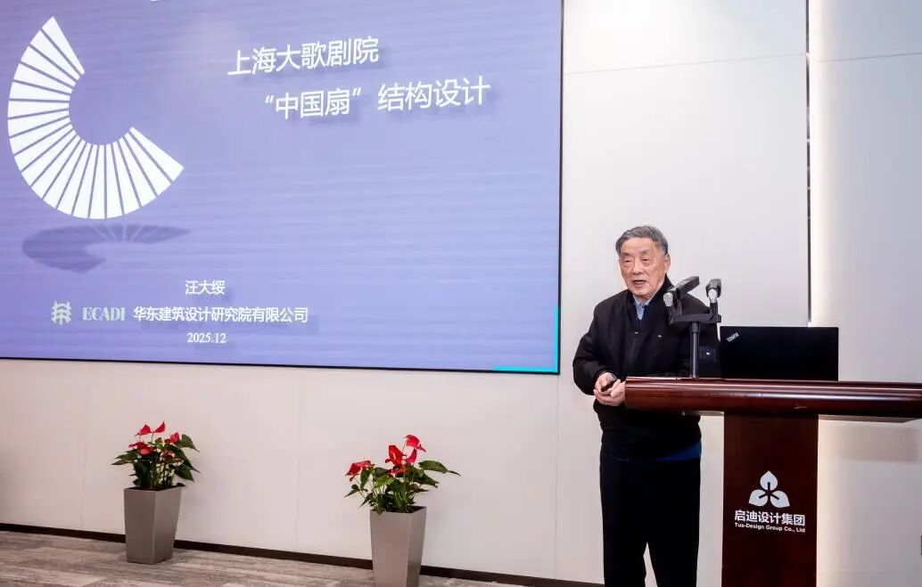 全国勘察设计大师汪大绥作题为《上海大歌剧院·中国扇的结构设计》的报告,系统阐述了上海大剧院“中国扇”的结构设计,重点介绍了以“扇钉、扇面、扇头”为逻辑的屋盖结构体系,深入解读了国产超高性能混凝土(UHPC)在长达15米的巨型悬挑螺旋阶梯中的创新性应用。报告通过试验与监测,验证了该结构体系的安全与性能,体现了建筑与结构一体化、全生命周期的先进设计理念。