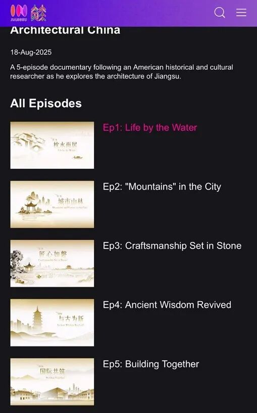 纪录片共5集,每集20分钟,分别为《枕水而居》《城市山林》《匠心如磐》《与古为新》和《国际共筑》,并已在江苏国际频道、美国Crossing TV、Youtobe、Ins、TikTok、Facebook等媒体平台发布。
