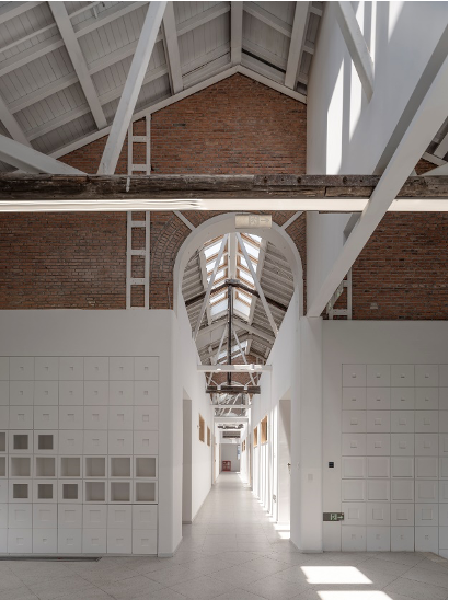 空间与功能再生。红砖墙面清洗修补,保留岁月痕迹;屋面植入模块化天窗系统,构建热压通道促进通风,实现适应季节的切换调整,发挥舒适节能的功效;新替换的窗户打破界限让建筑与自然相连。