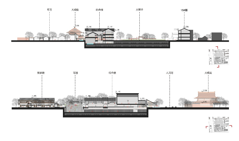 高度控制与体量消隐。校区整体建筑高度严格遵守文物保护相关规定,充分考虑与周边场所的关系。新建建筑首层沿人民路檐口低于大成殿首层檐口线高度,保持谦逊态度,同时采用连续的坡顶屋面形态,削弱建筑体量,与周边传统的建筑体量保持和谐统一。