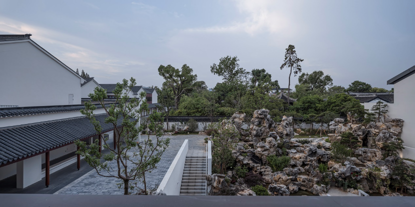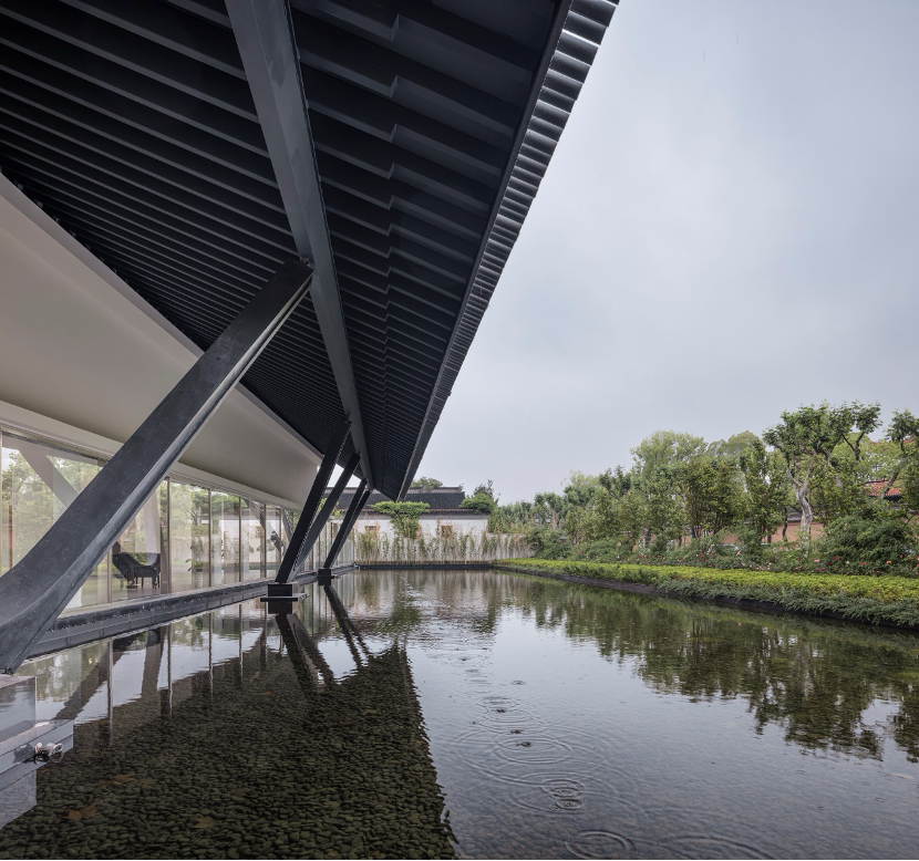 材质与意境的转译。我们没有直接模仿传统建筑的营造方式,而是运用现代材料进行转译:镂空砖墙过滤光线,投下随时间变化的阴影;钢木结构的单层挑檐,暗合传统建筑连廊的韵律。新建的水景园林以现代手法演绎传统叠山理水,与沧浪亭形成跨越时空的对话。