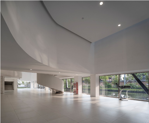 物理层面的退让。将校园沿人民路的部分边界向内退让,释放出的空间转化为城市亲水景观带,行人能够在亲水平台驻足停留,透过开放式的落地玻璃望见校园内部的日常景象,而校内师生亦可透过首层的玻璃望向城市街景,或通过三层的观景窗看向大成殿。