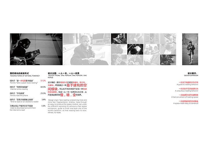装置式的空间模块,不同的场景下实现一种快速的空间转换,引导人们完成一人一书一世界的完整阅读行为,改变阅读的碎片化。