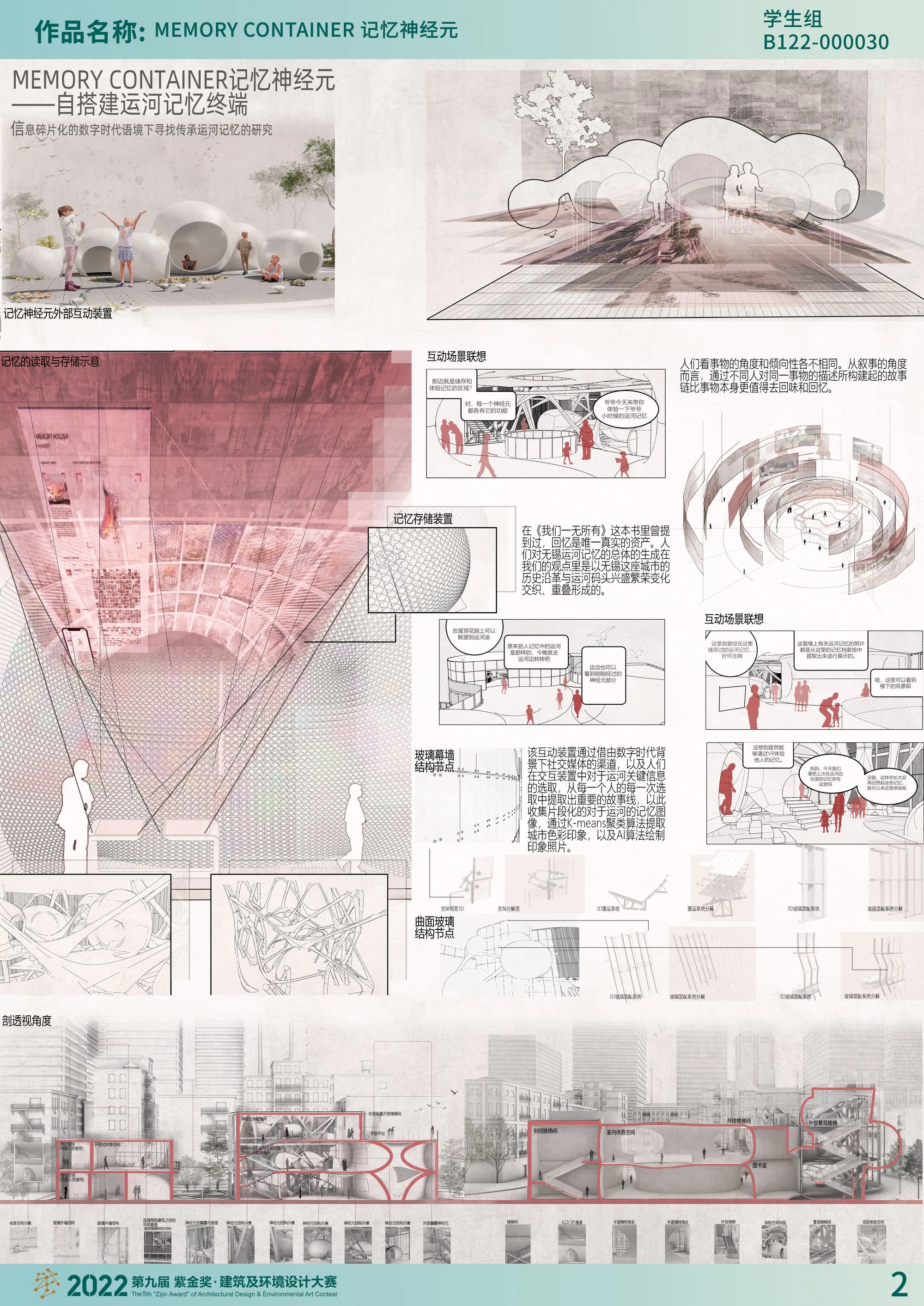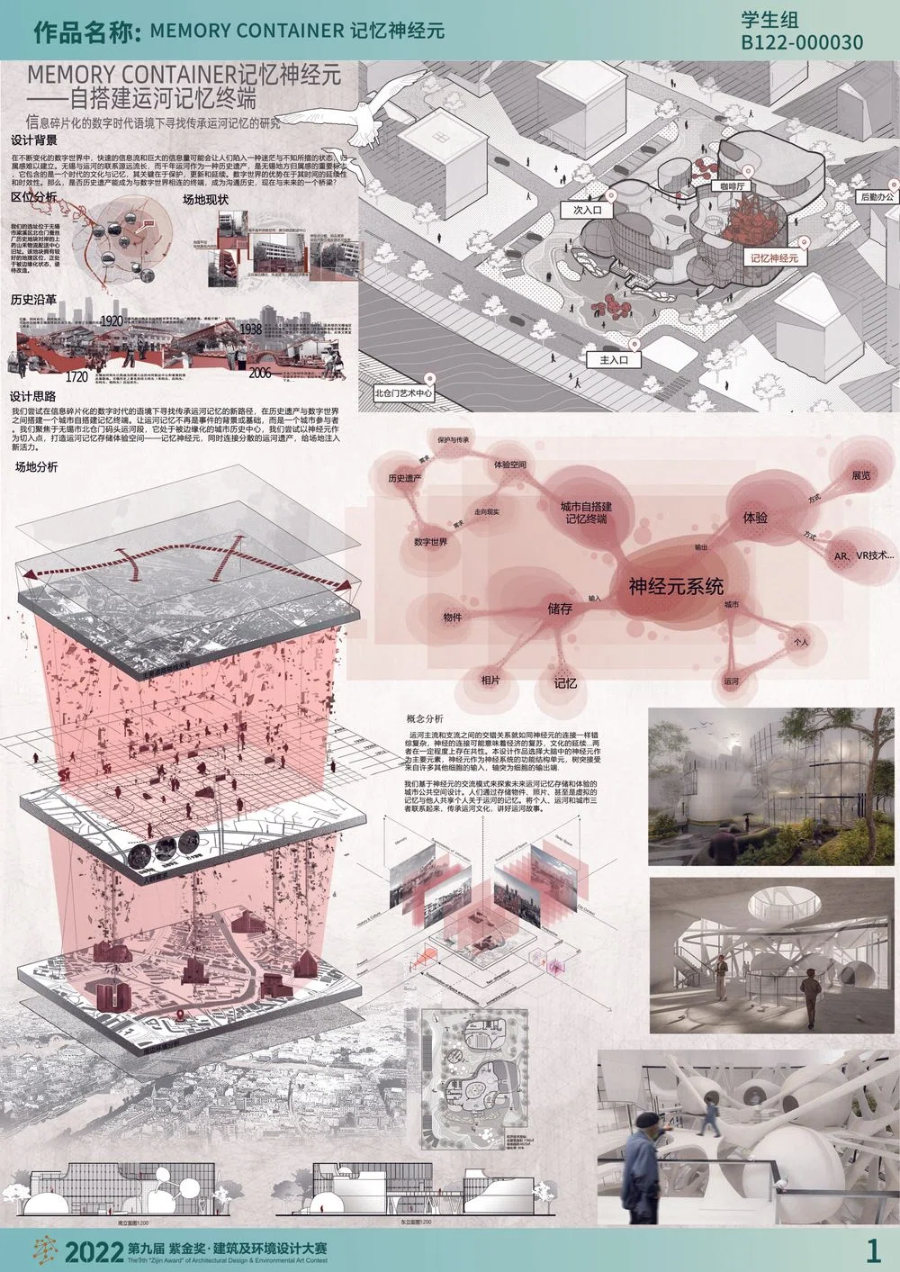在不断变化的数字世界中,快速的信息流和巨大的信息量可能会让人们陷入一种迷茫与不知所措的状态,归属感难以建立。无锡与运河的联系源远流长,而千年运河作为一种历史遗产,是无锡地方归属感的重要标志,它包含的是一个时代的文化与记忆,其关键在于保护,更新和延续。数字世界的优势在于其时间的延续性和时效性。那么,是否历史遗产能成为与数字世界相连的终端,成为沟通历史,现在与未来的一个桥梁?我们尝试在信息碎片化的数字时代的语境下寻找传承运河记忆的新路径,在历史遗产与数字世界之间搭建一个城市自搭建记忆终端。让运河记忆不再是事件的背景或基础,而是一个城市参与者。我们聚焦于无锡市北仓门码头运河段,它处于被边缘化的城市历史中心,我们尝试以神经元作为切入点,打造运河记忆存储体验空间——记忆神经元,同时连接分散的运河遗产,给场地注入新活力。