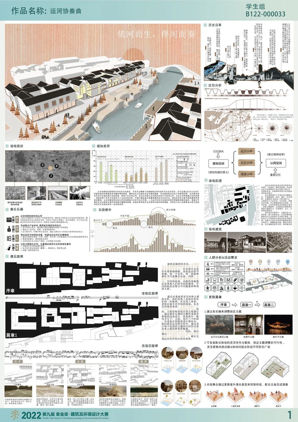 建筑是凝固的音乐,以建筑为主体的群体空间便是由多个篇章组成的交响乐。在乐曲中总是存在着抑扬顿挫、高低起伏的节奏感,每一个音符,每一段旋律都在书写着整首乐曲。同样,在街区中,同样存在着类似的节奏感,空间的收放、功能的变换都在改变着人们对空间的感受。不同的街段会吸引不同数量和种类的人群。通过对基地原有空间和人群的分析,我们发现了老街区所存在的一些旋律,从空间上来看,老街区缺少对空间的规划,从音乐的角度来看,老街区则缺少了开头的引子,主段的起伏等。因此,大致绘制老街区的五线谱后,通过修补乐谱的完整性来指导基地的改造设计。协奏曲中一般包含引子、主段、尾声三个阶段,对老街区的旋律进行修补后,我们将其运用到空间中,通过设计每个街段的主题和空间形式来改变人群的种类和数量,从而形成不同的空间旋律。此外,我们通过沿岸的码头设计来为该协奏曲加入必要的“和弦”,最后完成运河沿岸街区的协奏曲。