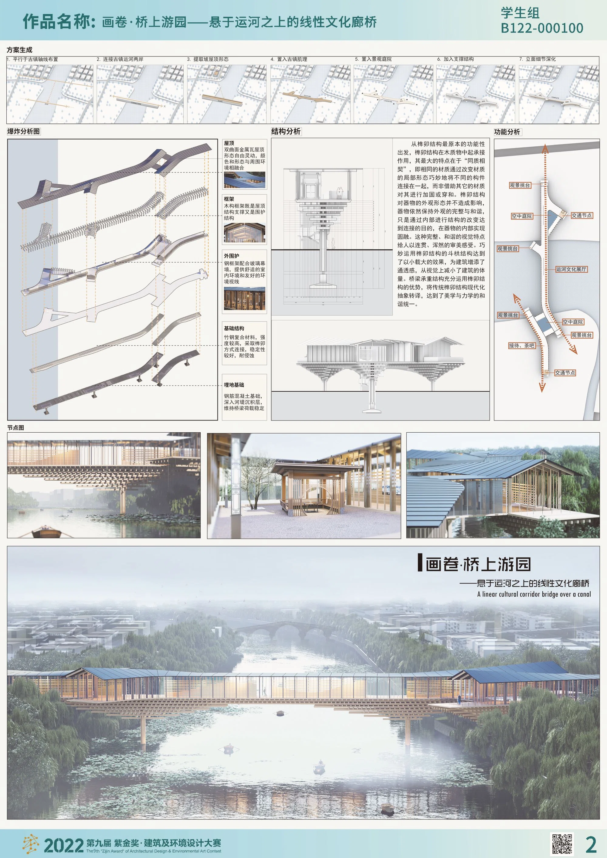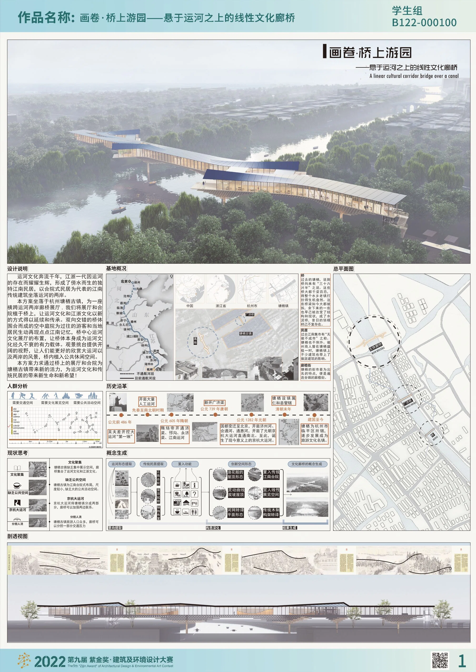本方案坐落于杭州塘栖古镇,为一座横跨运河两岸廊桥展厅,我们将展厅和合院植于桥上,让运河文化和江浙文化以新的方式得以延续和传承。双向交错的桥体围合而成的空中庭院为过往的游客和当地居民生动再现点点江南记忆,桥中心运河文化展厅的布置,让桥体本身成为运河文化经久不衰的有力载体。观景挑台提供开阔的视野,让人们能更好的欣赏大运河以及两岸的风景,桥内植入公共休闲空间。