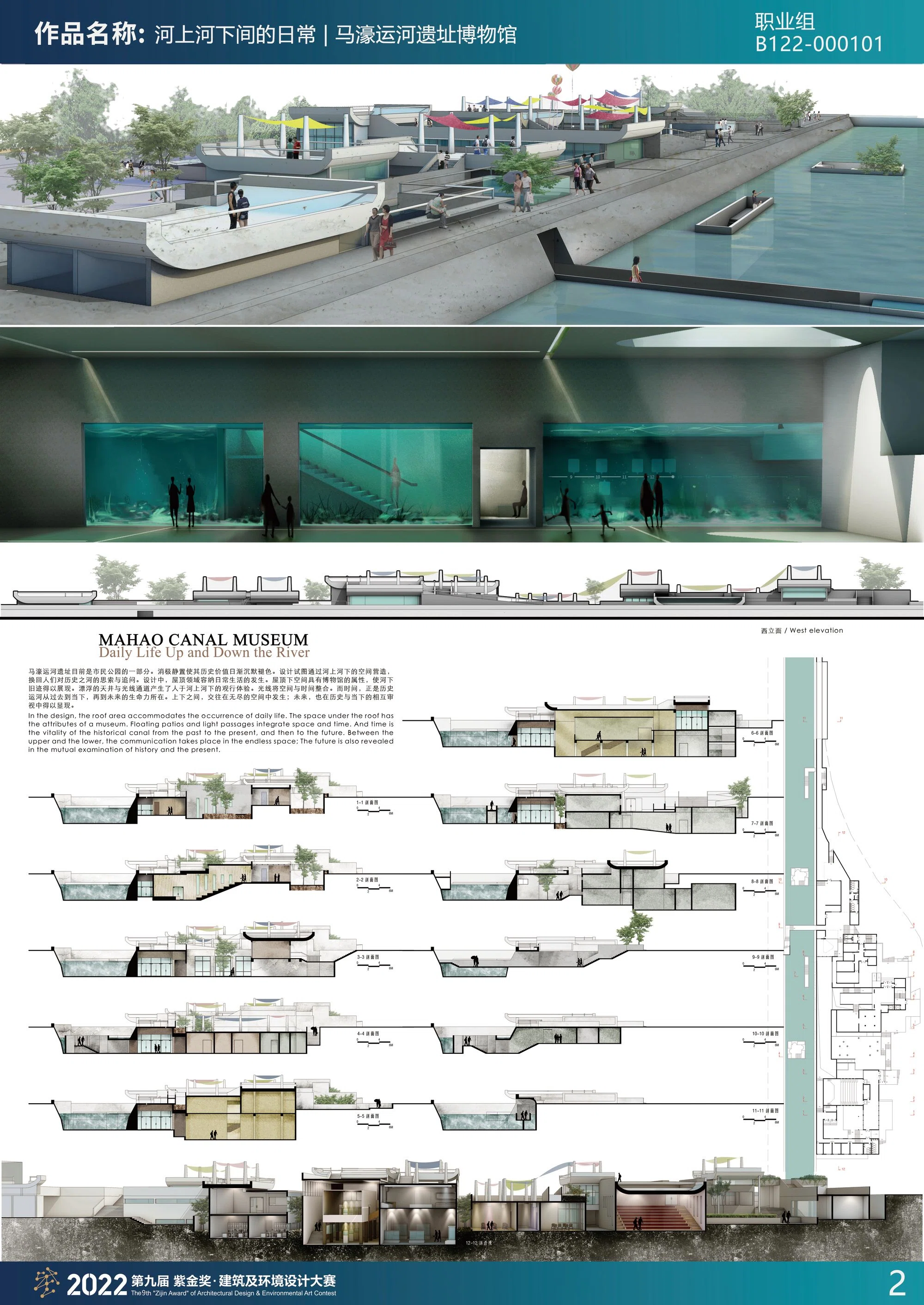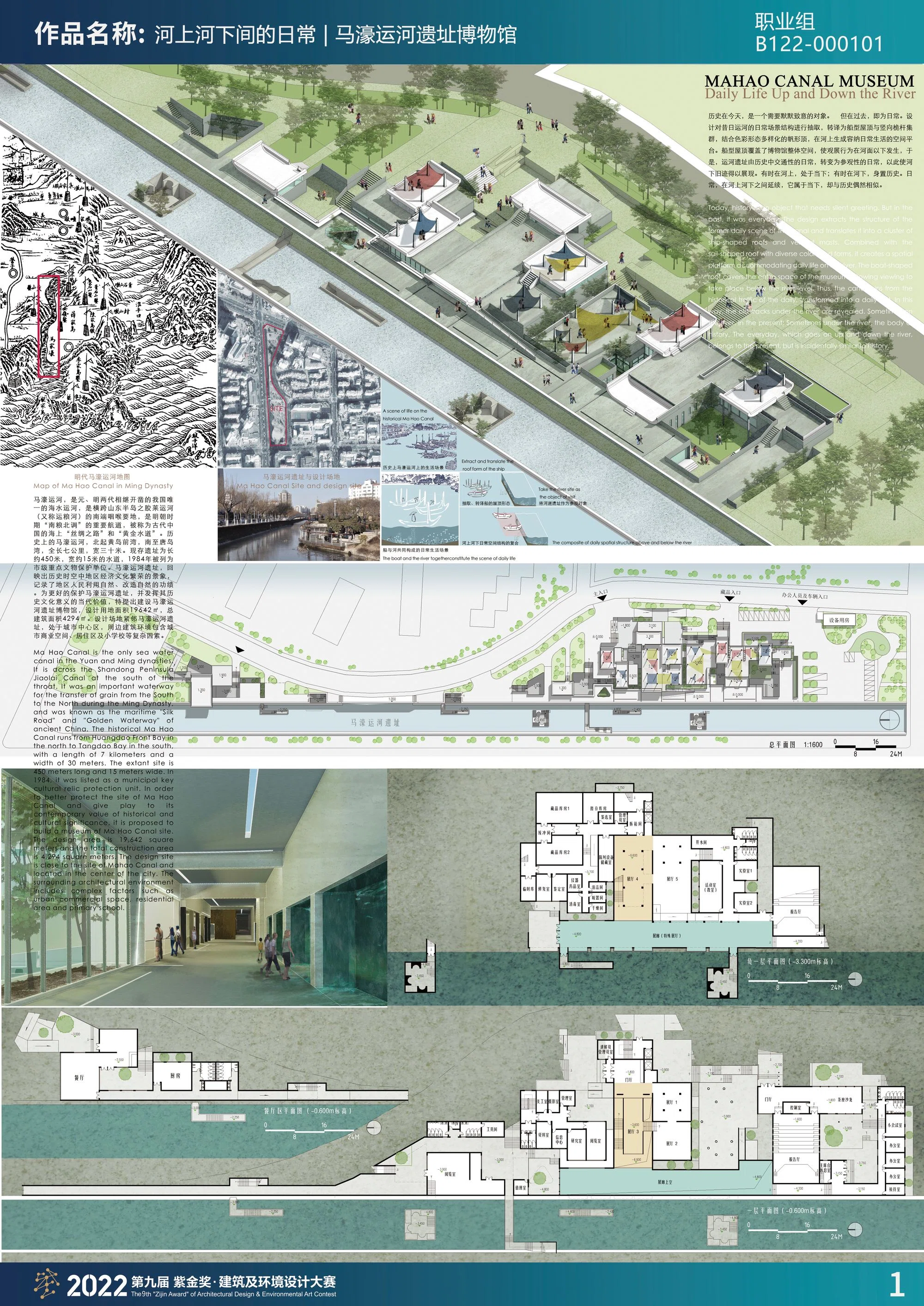 马濠运河,是元、明两代相继开凿的我国唯一的海水运河,是横跨山东半岛之胶莱运河(又称运粮河)的南端咽喉要地,是明朝时期“南粮北调”的重要航道,被称为古代中国的海上“丝绸之路”和“黄金水道”。历史上的马濠运河,北起黄岛前湾,南至唐岛湾,全长七公里,宽三十米。现存遗址为长约450米,宽约15米的水道,1984年被列为市级重点文物保护单位。马濠运河遗址,回映出历史时空中地区经济文化繁荣的景象,记录了地区人民利用自然、改造自然的功绩。为更好的保护马濠运河遗址,并发挥其历史文化意义的当代价值,特提出建设马濠运河遗址博物馆,设计用地面积19642㎡,总建筑面积4294㎡。马濠运河遗址目前是市民公园的一部分。消极静置使其历史价值日渐沉默褪色。设计试图通过河上河下的空间营造,换回人们对历史之河的思索与追问。设计中,屋顶领域容纳日常生活的发生。屋顶下空间具有博物馆的属性,使河下旧迹得以展现。漂浮的天井与光线通道产生了人于河上河下的观行体验。光线将空间与时间整合。而时间,正是历史运河从过去到当下,再到未来的生命力所在。上下之间,交往在无尽的空间中发生;未来,也在历史与当下的相互审视中得以显现。