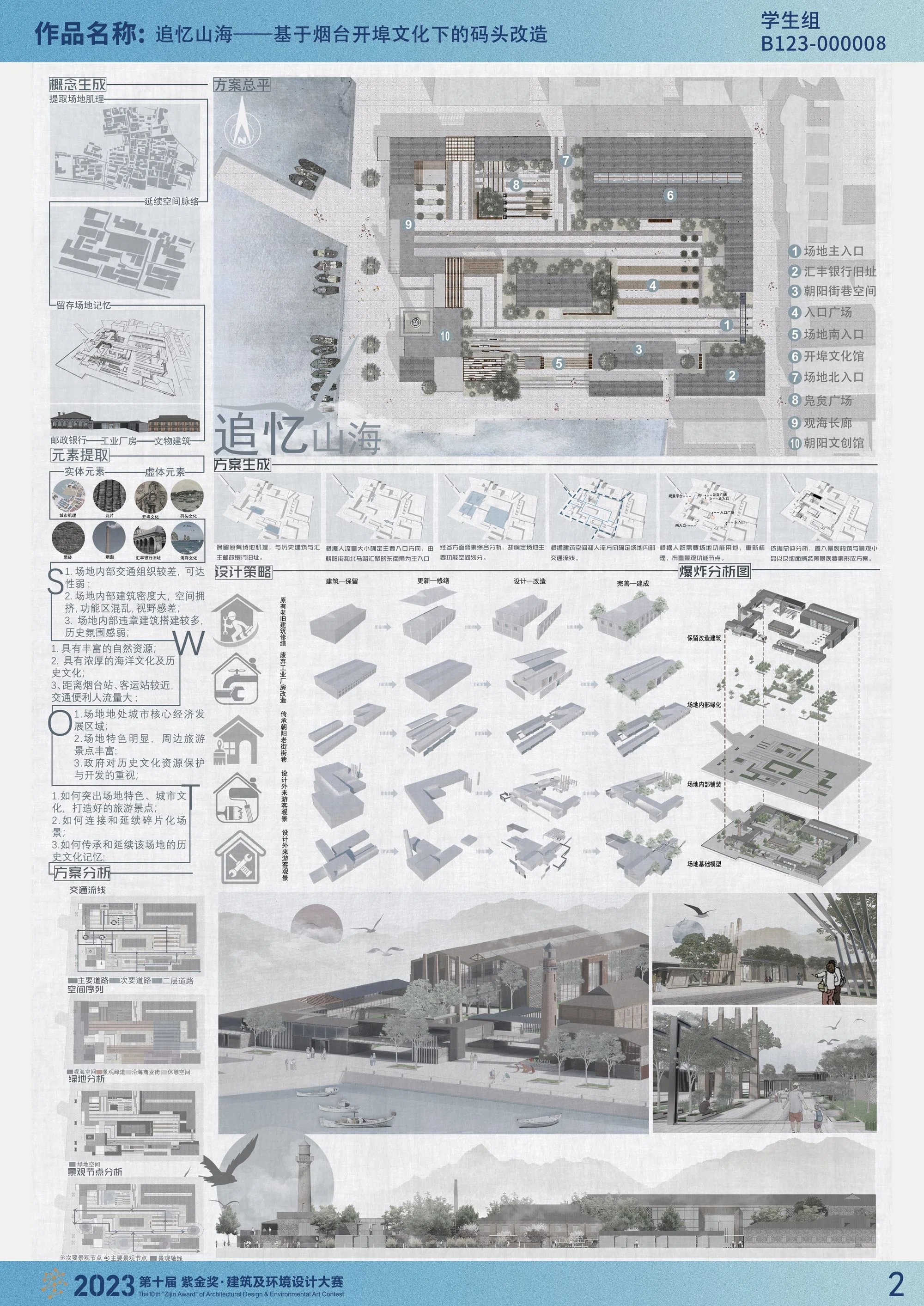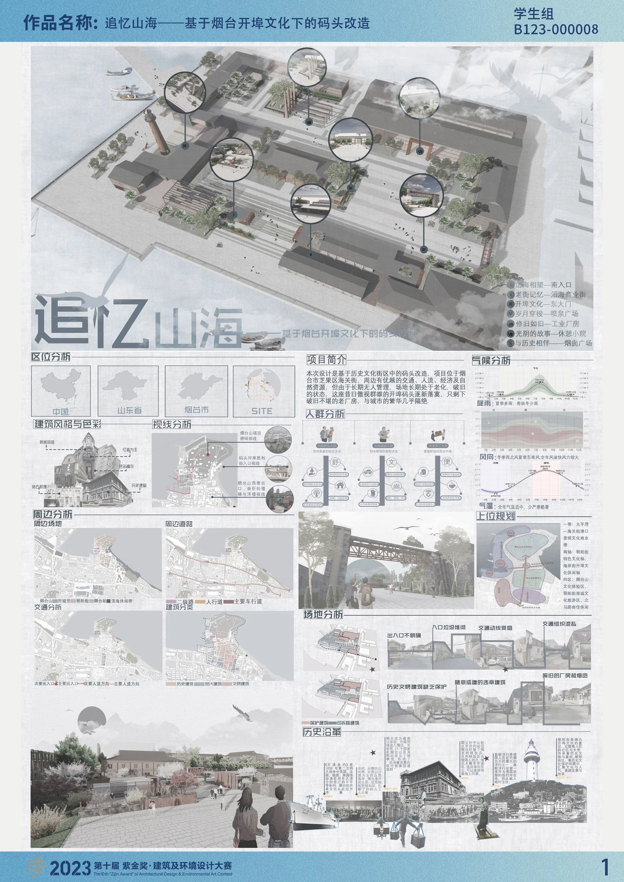 本项目定位于山东省烟台市。首先,在充分的分析场地及周边的人文与气候环境的基础上,尊重场地现状,并将“修旧如旧”作为设计理念,对烟台市1861太平湾码头进行改造设计。其次,场地主要使用长直线自然划分的手法,组织了路网和景观节点,打造一个“海洋文化”与“开埠文件”的景观空间。再次,该项目将建立开埠文化馆、营造文旅景观、海洋生态路线、体验路线这几个路线相结合进行设计。最后,该项目设计着意营造轻松、温馨的氛围,力求将“海洋文化”理念与“开埠文化”融入功能需求,为人们创造自然优美、多元丰富、舒适的户外活动空间。