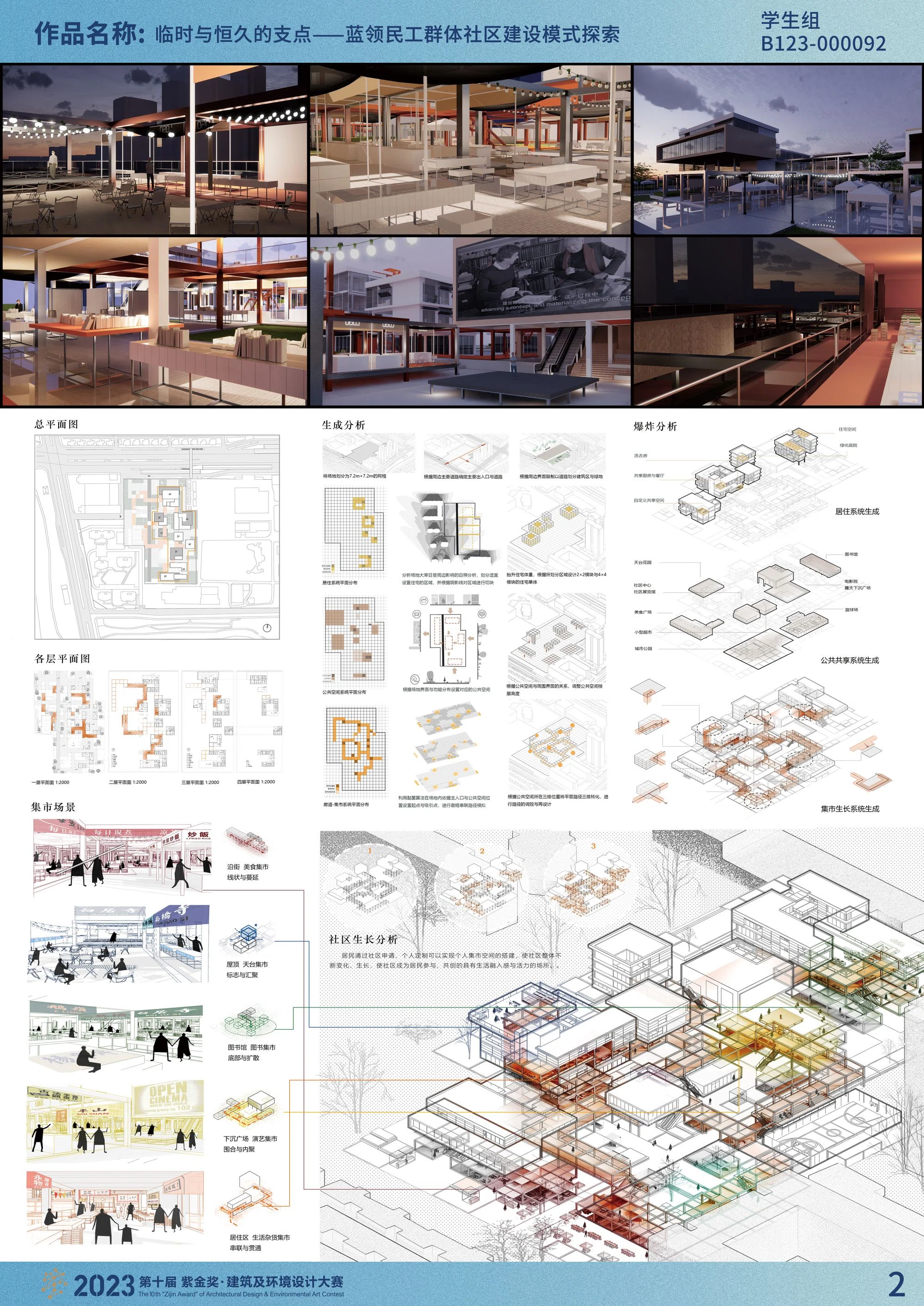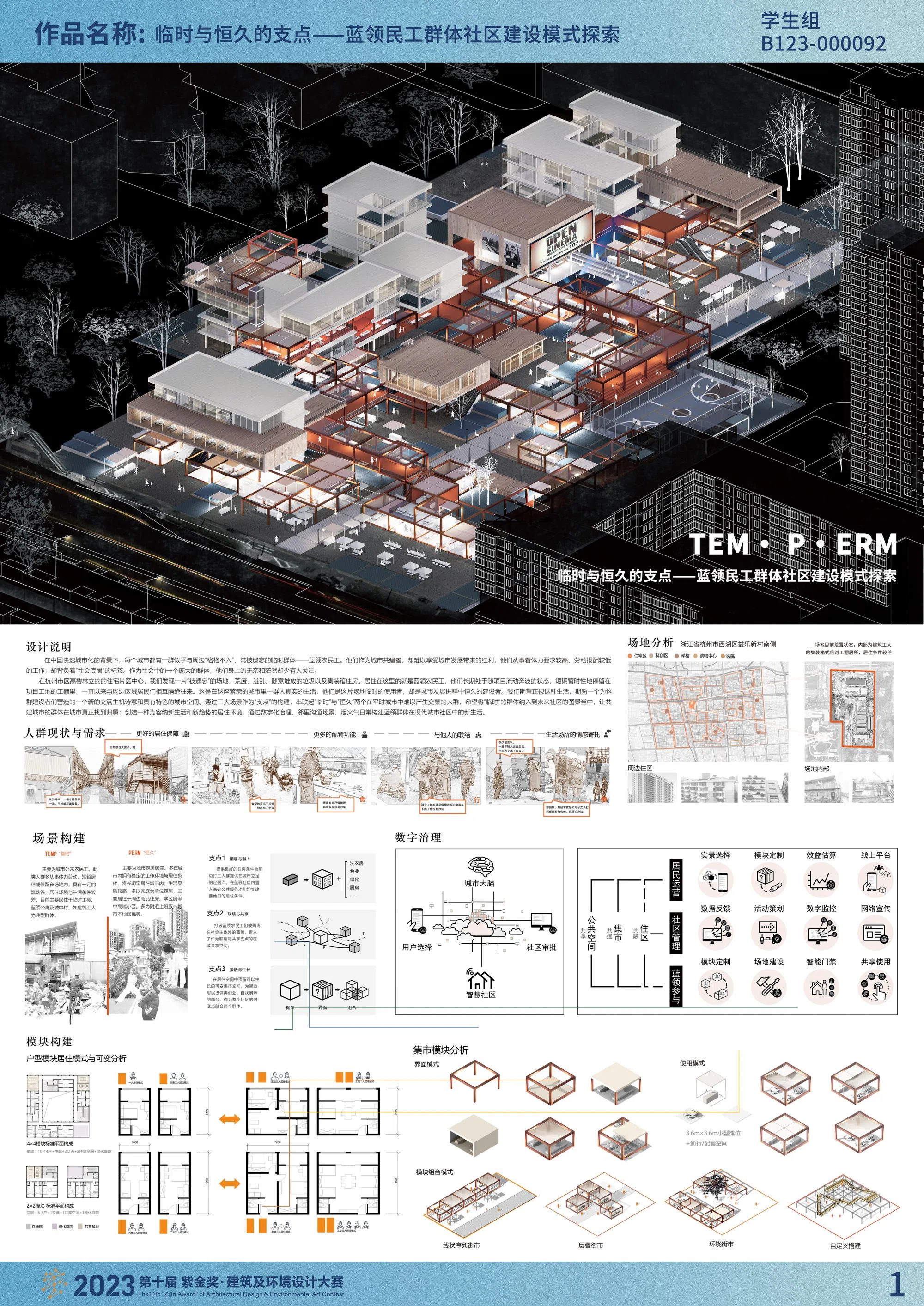 在杭州市区高楼林立的的住宅片区中心,我们发现一片"被遗忘的场地”,荒废、脏乱、随意堆放的垃圾以及集装箱临时住宅。居住在这里的就是蓝领农民工,他们长期处随项目流动奔波的状态,短期暂时生地停留在项目工地的工棚里,生活却来与周边居民隔绝开来——这是在这座繁华的城市里一群人真实的生活,他们是这片场地临的的使用者,却是城市发展进程中恒久的建设者。我们期望为他们营造的一个新的充满生机诗意和具有特色的城市空间。通过三大目标“栖居与融入”“联结与共享”“激活与生长”作为”支点"的构建,提供良好的住房条件并内置公共服务功能与区域共享空间打破蓝领农民工们被隔离在社会主体外的藩篱,在居住空间中预留可以生长的可变集市空间,为周边居民提供再创业、自我展示的舞台,作为整个社区的激活点融合两个群体。