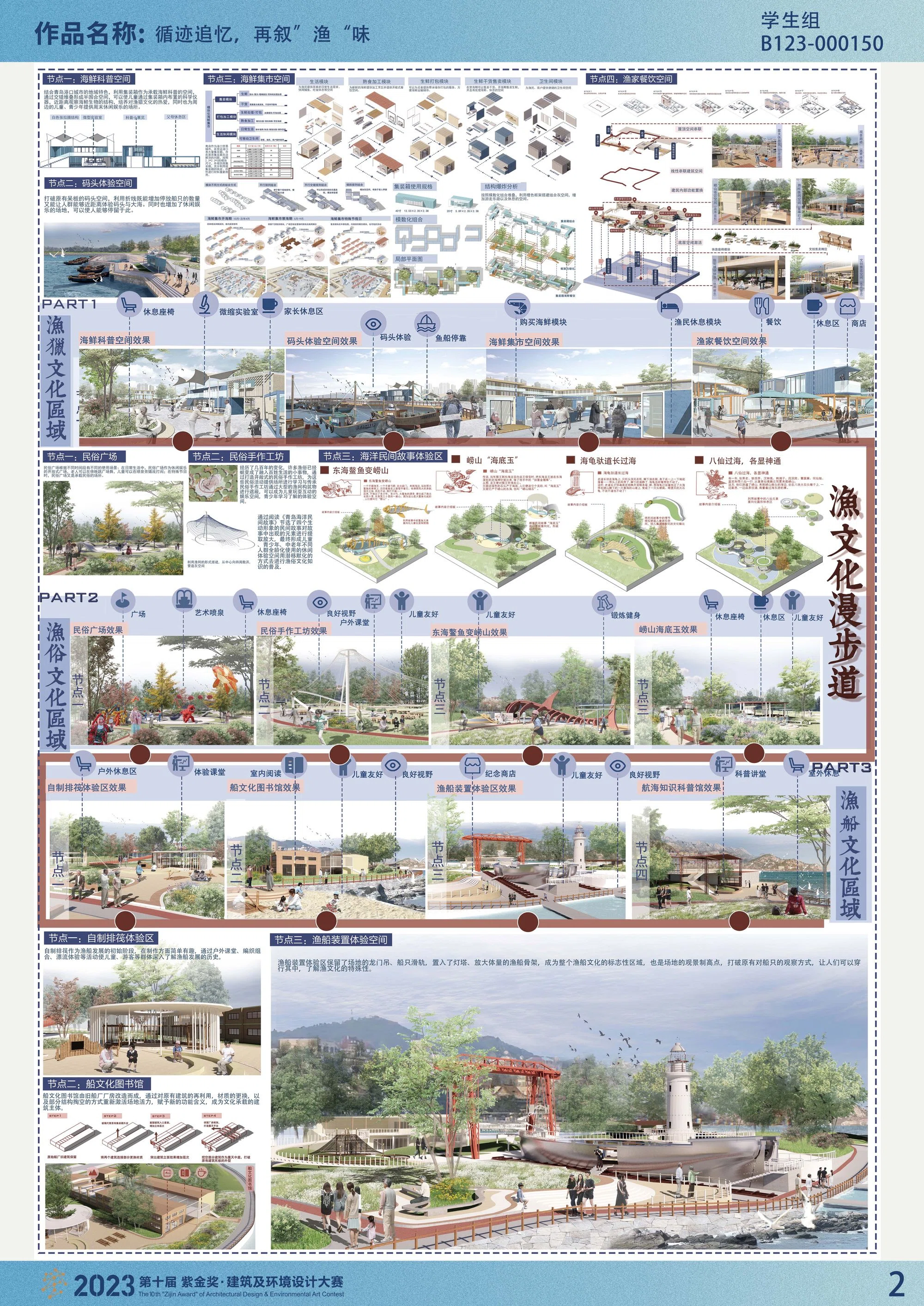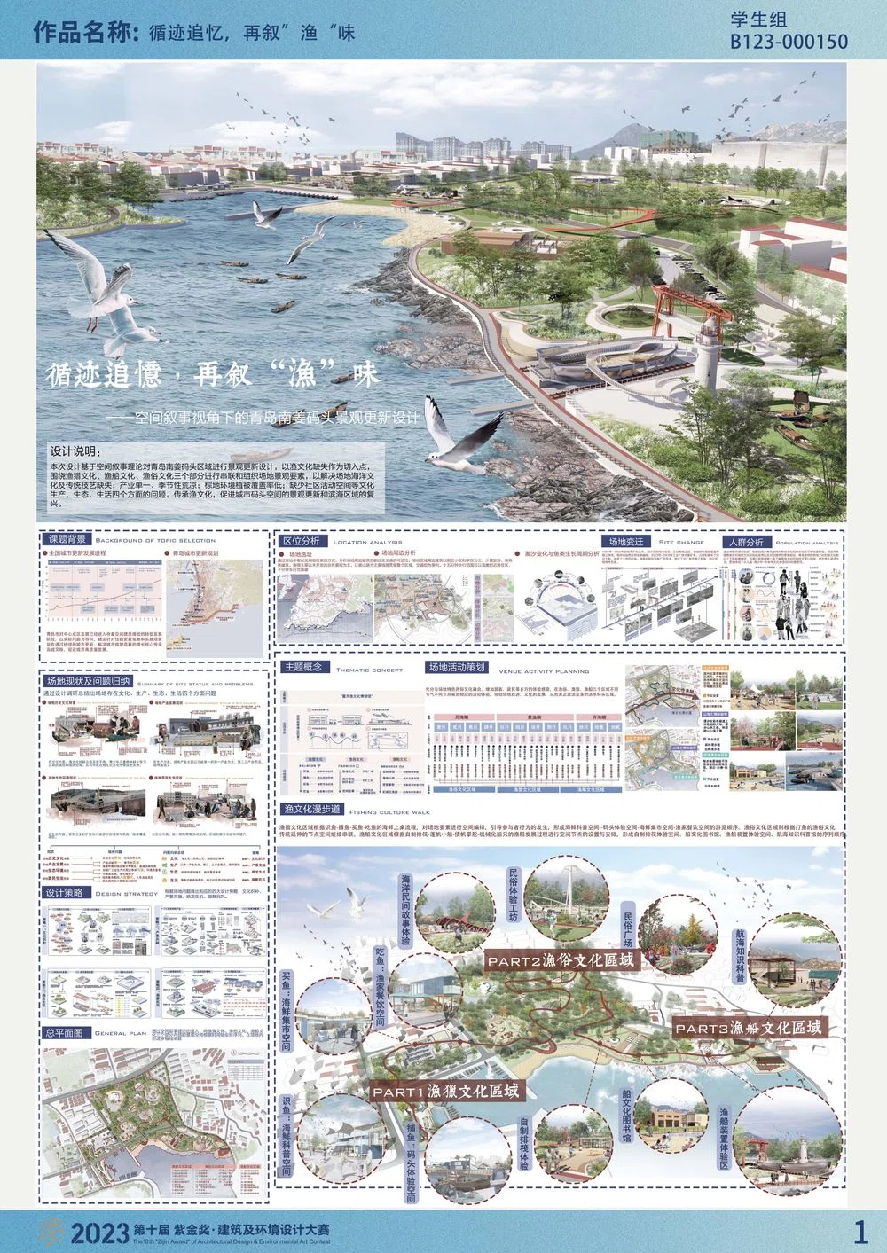 以青岛南姜码头区域作为设计对象,弥补青岛滨海步道的断点。将渔文化缺失问题作为切入点,以“露天渔文化博物馆”为主题概念,通过空间叙事理论的置入,对渔猎文化、渔俗文化、渔船文化三个区域内部景观进行时间轴线串联。用文化织补、产景共融、焕发生机、凝聚民风四大策略解决场地海洋文化及传统技艺缺失;产业单一、季节性荒凉;棕地环境植被覆盖率低;缺少社区活动空间等文化、生产、生态、生活四个方面的问题。为青少年儿童群体提供学习认知的途径和场所空间,形成文化渗透闭环,延续青岛渔文化与传统民俗技艺,激活没落渔港码头区域。
