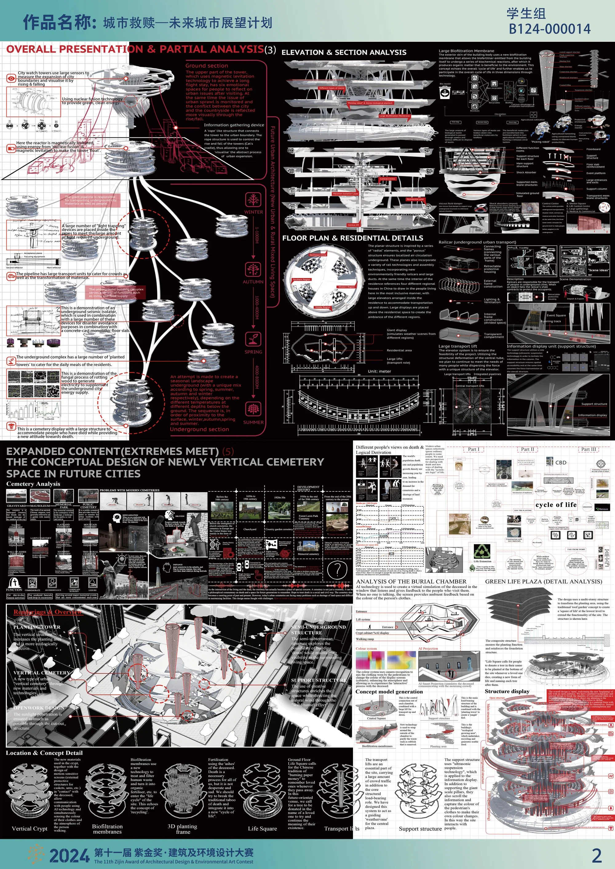 在未来,随着人口老龄化,死亡将永远是人类不变的话题。在这里,我们试图建立一个未来的新型垂直墓地,以容纳“已知”和“未知”,建立一个新时代的人类纪念碑。大量的人在地下城市生活的各个单元之间被运送基本的物质转化通过这条管道发生。设计了一种地面光采集系统,并利用天文望远镜原理进行光反射,以满足地下光的采集。这种植物像根一样的形式是一种“破土而出”的新生活方式的隐喻。
