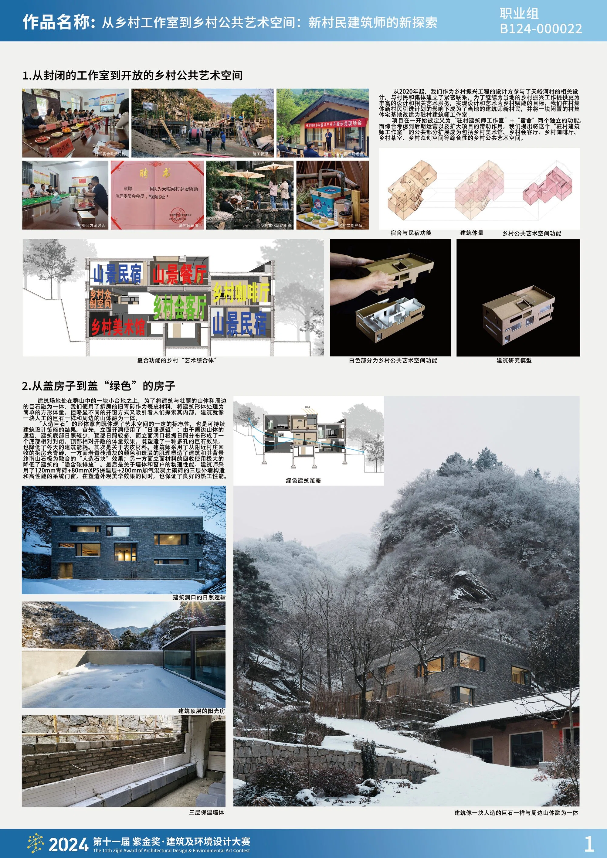 在乡村振兴的时代背景下,新村民建筑师的乡村工作室除了作为建筑师自己的工作和宿舍空间,能不能成为一个更广泛地服务乡村振兴的公共空间?本项目从以下四个方面进行了探索:第一,从封闭的工作室到开放的乡村公共艺术空间,本项目将工作室的公共空间向村民开放,成为了一个复合的乡村公共艺术空间,实现了艺术和设计为乡村振兴赋能的目的;第二,从盖房子到盖“绿色”的房子,本项目不仅将建筑形体和周边环境融为一体,更是从洞口布局、立面材料、墙体构造、被动绿色建筑策略等多方面进行了可持续建筑设计的探索;第三,从公共空间到高品质的公共空间,本项目不仅实现了功能设置上的开放和公共,在如何提高室内公共空间的品质方面也进行了特殊的设计,通过透明性的两个视线通廊的设计,将不同的公共空间功能在视觉上连接在一起,不仅在空间美学上提升了空间的公共性和开放性,同时也形成了贯穿整个建筑的穿堂风,降低了夏季的能耗;第四,从艺术空间提供者到乡村艺术内容提供者,本项目中建筑师不仅仅是艺术空间的设计者和提供者,更是艺术内容的提供者和主理人,我们将在地的乡土艺术和城市艺术资源结合起来,定期常态化地举办设计活动、乡村音乐节、乡村摄影展等艺术活动。