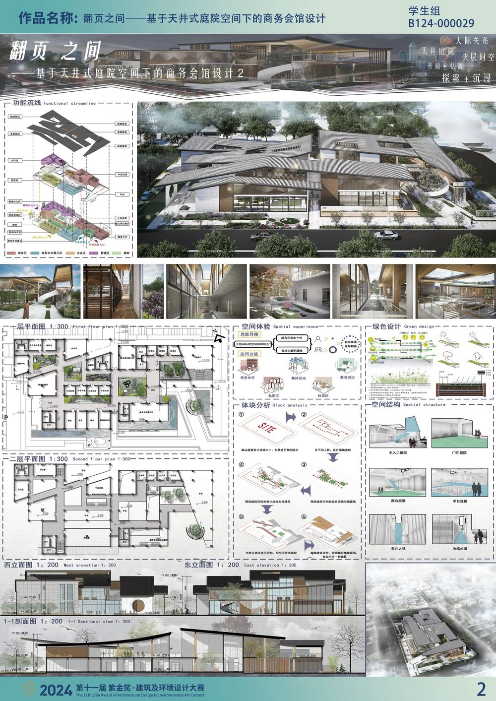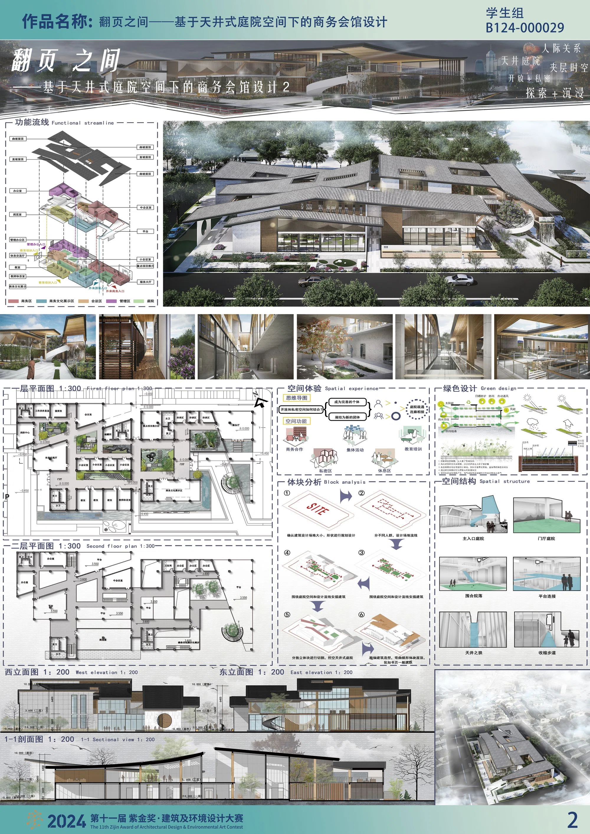 本设计定义为商务会馆设计。建筑以使用空间围绕天井庭院空间的形式出现。这一形式既解决了建筑所需的采光通风,又使建筑空间分而不离,兼顾公共性与私密性。将这一形式投射到会馆之中,并同语反复,形成大小尺度,功能各异的庭院结构。经由建筑本体错落围合而成的院落空间,减轻建筑内部的压抑感,为室内空间引入风,光及景观。二层与一层空间的错动,更加丰富使用者对建筑的空间体验,也为建筑提供景观垂直绿化空间。建筑造型由折顶和曲顶瓦山构成,瓦山各自起伏连绵,犹如书页一般飘扬。
