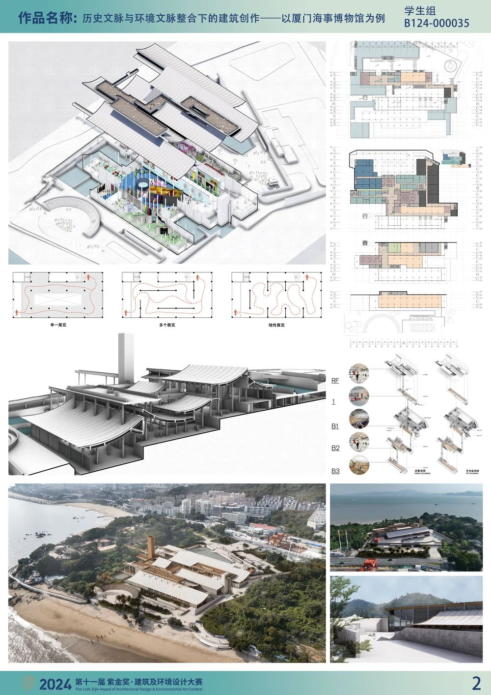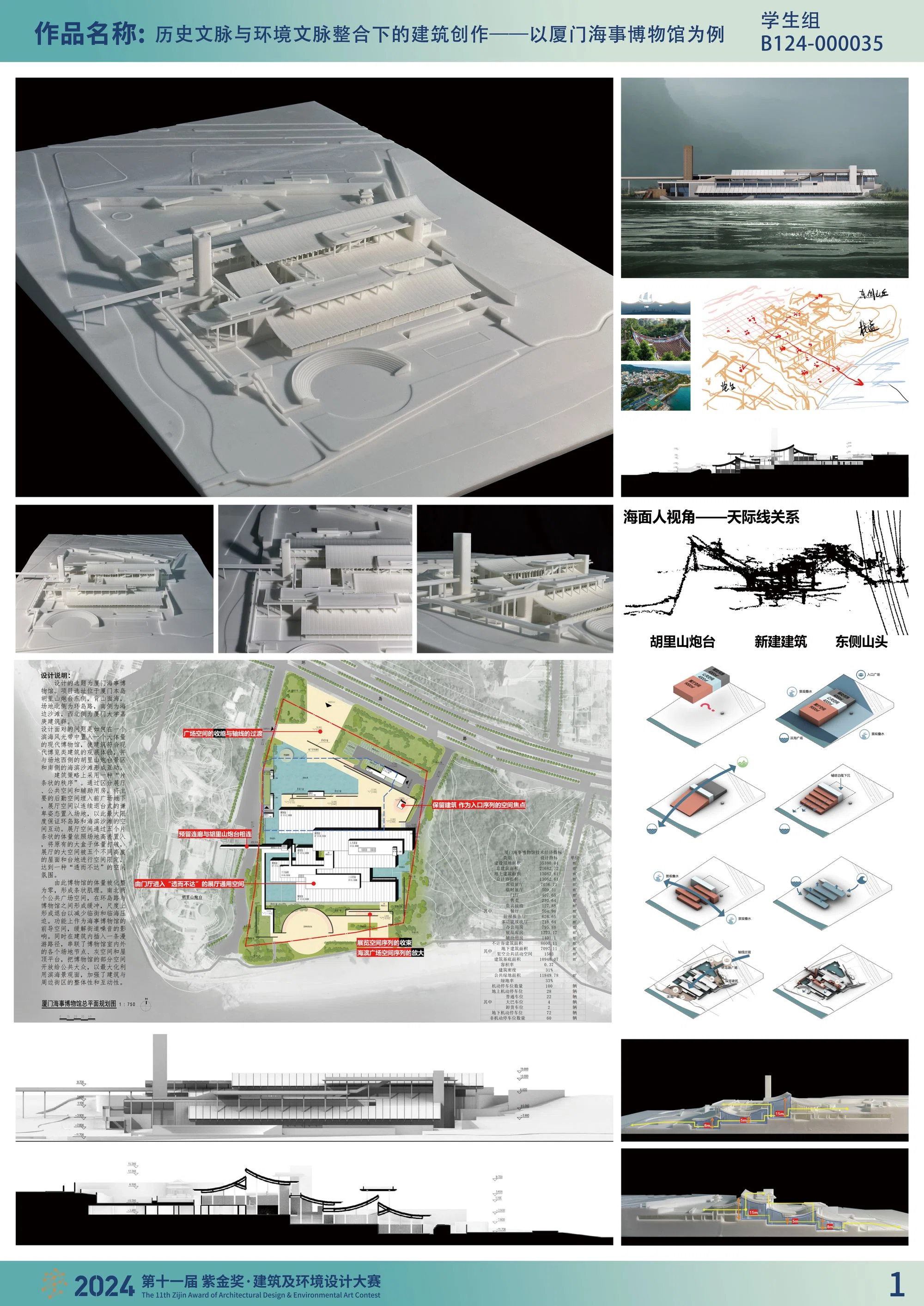 设计的选题为厦门海事博物馆。项目选址位于厦门本岛胡里山炮台东侧,背山面海,场地北侧为环岛路,南侧为海边沙滩,西北侧为厦门大学嘉庚建筑群。设计面对的问题是如何在一个滨海风光带中置入一个大体量的现代博物馆,使建筑符合现代博览类建筑的观展体验,并与场地西侧的胡里山炮台景区和南侧的海滨沙滩形成互动。