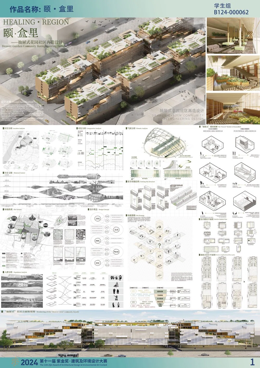 本项目选址于湖北省武汉市武昌区粮道街中医社区,经调研后针对社区现存问题如建筑老化、低空间利用率、绿化面积被挤压等问题,提出“抽屉式”模块更新概念以及生态走廊构想,旨在针对不同人群构建不同抽屉式模块,置入社区建筑体块中,搭配起重机和滑轨实现建筑更新迭代,有效解决建筑老化,更新周期长等问题;生态走廊构想是充分保障空间利用率的同时缓解了绿化面积被挤压问题,让社区居民能够在此慢下来,发挥自然疗愈功能;生态走廊配合连桥在串联社区的同时保障了抽屉式社区模块的私密性及互动性。