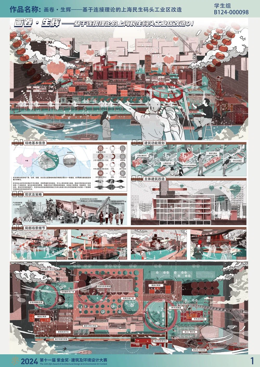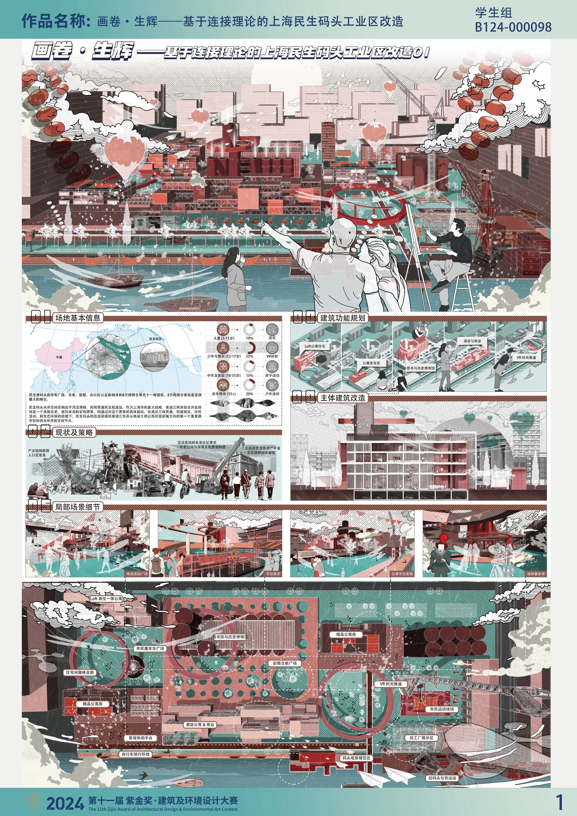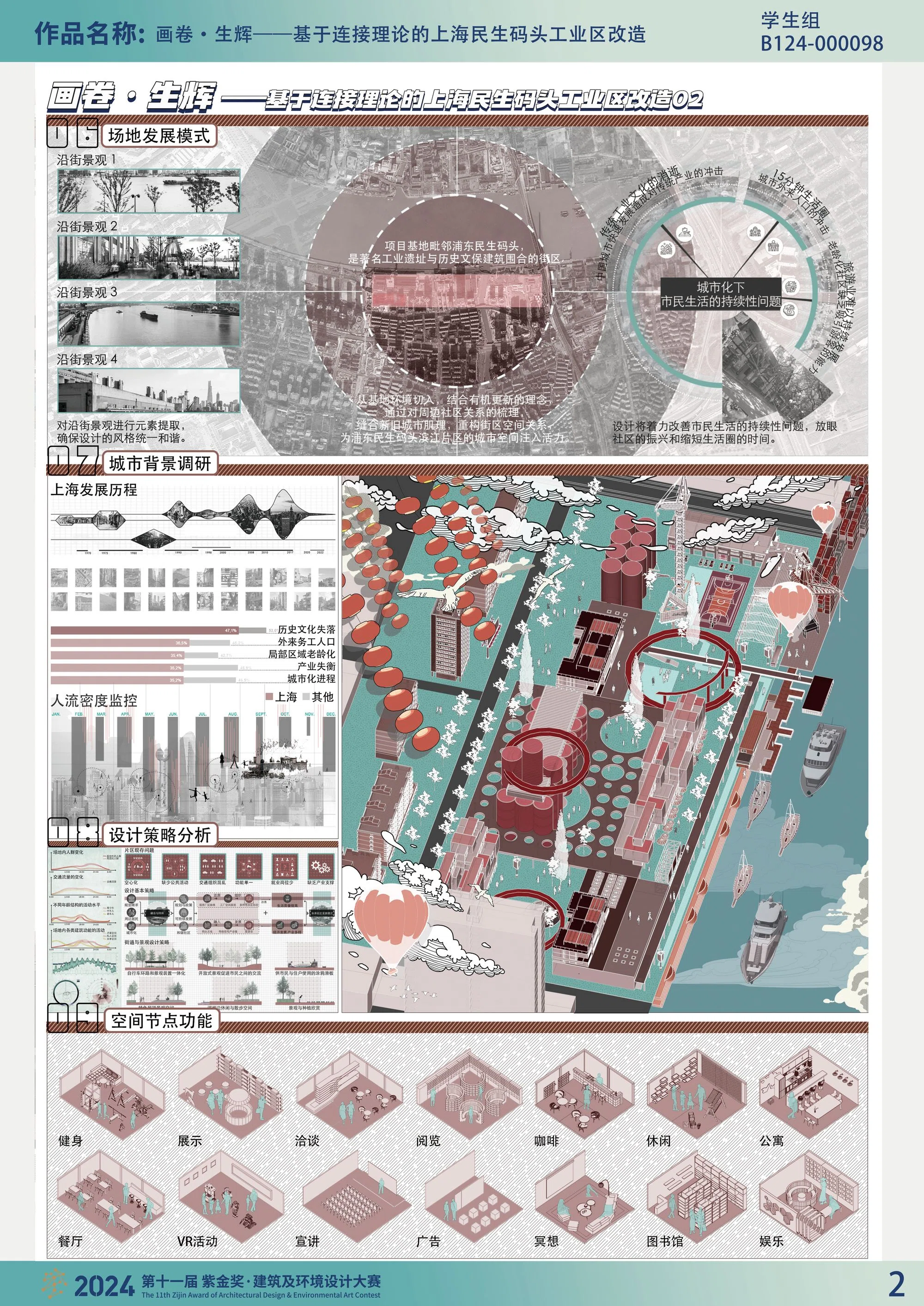 本设计方案于连接理论之下,从基地环境切入,结合有机更新理念,通过对周边社区关系的梳理,缝合新旧城市肌理,重构街区空间关系,为浦东民生码头滨江片区的城市空间注入活力。着重解决空心化、缺少公共劳动、交通组织混乱、功能单一、就业岗位少、缺少产业支撑等问题。本次设计本着提高居民的生活质量、促进经济发展以及产业多样性、创造未来社区发展新模式为最终目标。
