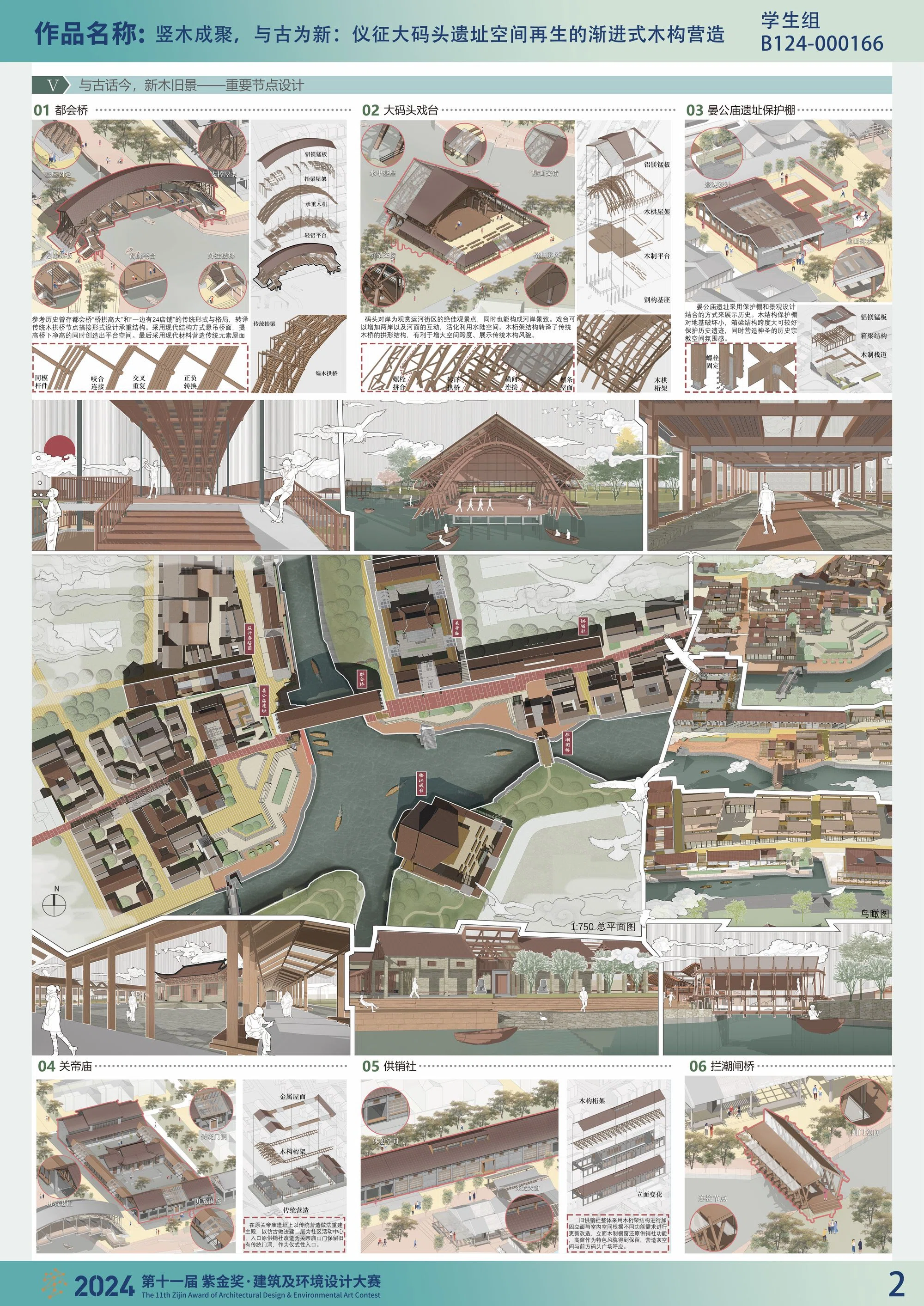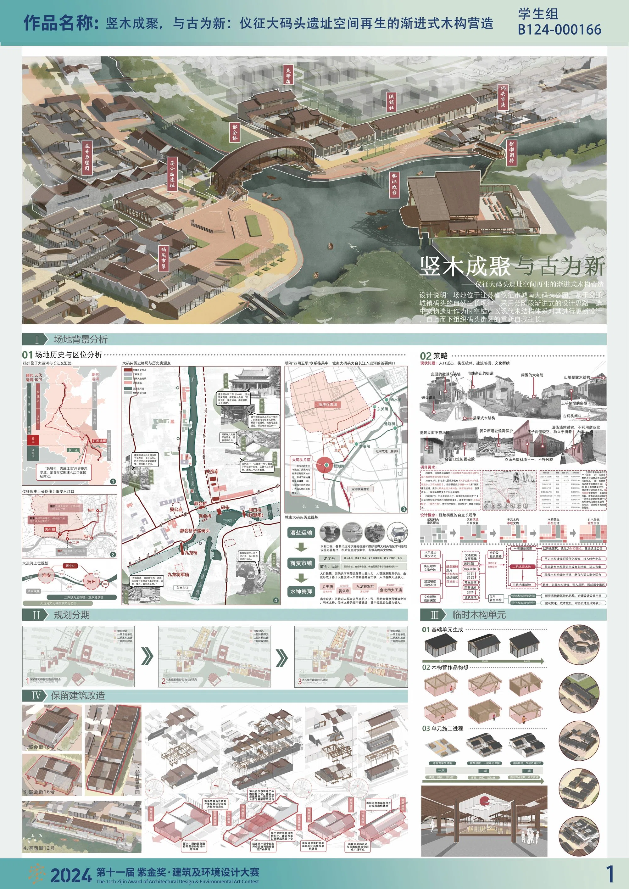 设计规划旨在恢复仪扬运河及城南河河道,并修缮拦潮闸、大码头和河岸纤道。同时,原址重建以都会桥、关帝庙、晏公庙遗址、益升泰酱园、供销社等历史保留建筑遗址作为连接古今的时空锚点,采用现代木结构设计,对时空锚点进行重建、改造、保护建设,以再现四水交汇的大都会景象。为符合古镇自然生长规律,避免过大成本的大开发,项目设计科学地分为三期阶段进行:第一阶段名为遗韵园影,对供销社、酱园等历史保留建筑进行修缮与微改造,并新增木栱形式的都会桥、拦潮闸桥为园内中心景致,整体以大片绿地为主,零散的历史建筑遗址节点点缀,定位为历史遗址公园。第二阶段名为水岸木语,以现代木结构节点设计为主要导向。建立面向大学生的木构营,参与设计木结构单元,后植入设计完成的临时木结构单元,营造码头市集商业。对供销社、酱园等历史保留建筑进行改造更新并植入业态,并新增木栱形式的都会桥、拦潮闸桥为园内中心景致。第三阶段名为古巷新绘,完善二阶段的单元木构建筑、新增建筑,引入居民。本方案中以第二阶段为设计重点,以木构节点为锚点重塑仪征城南大码头核心区。