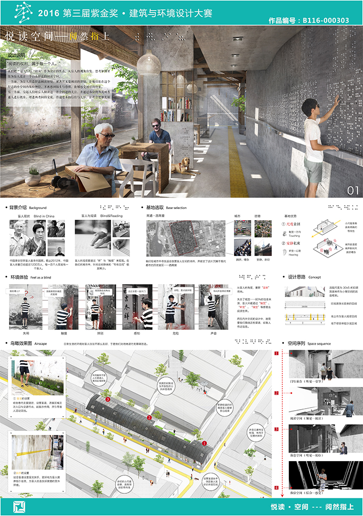 方案综评:方案《阅然“指”上》基于城市空间活动的公平性理念,从关注城市视障人群 的角度出发,利用城市生活区中的小尺度空间创造性的设计了富有特色的独特的阅读空 间。该方案通过对视障人群活动特点和所需空间尺度的分析,创造了行走、独坐和休闲阅读的都市小空间,并结合了电子和机械原理设想了可变的空间阅读元素,使 得方案更具可操作性。作为学生组的作品,该方案图纸表达清楚,创意空间的表现和空间细部建构的表达都比较到位,充分体现了良好的专业素养。