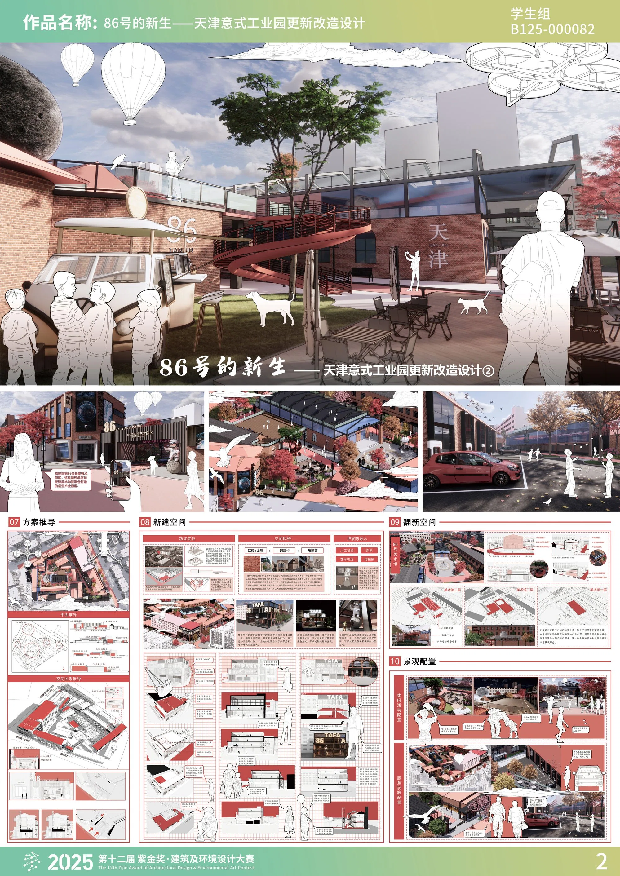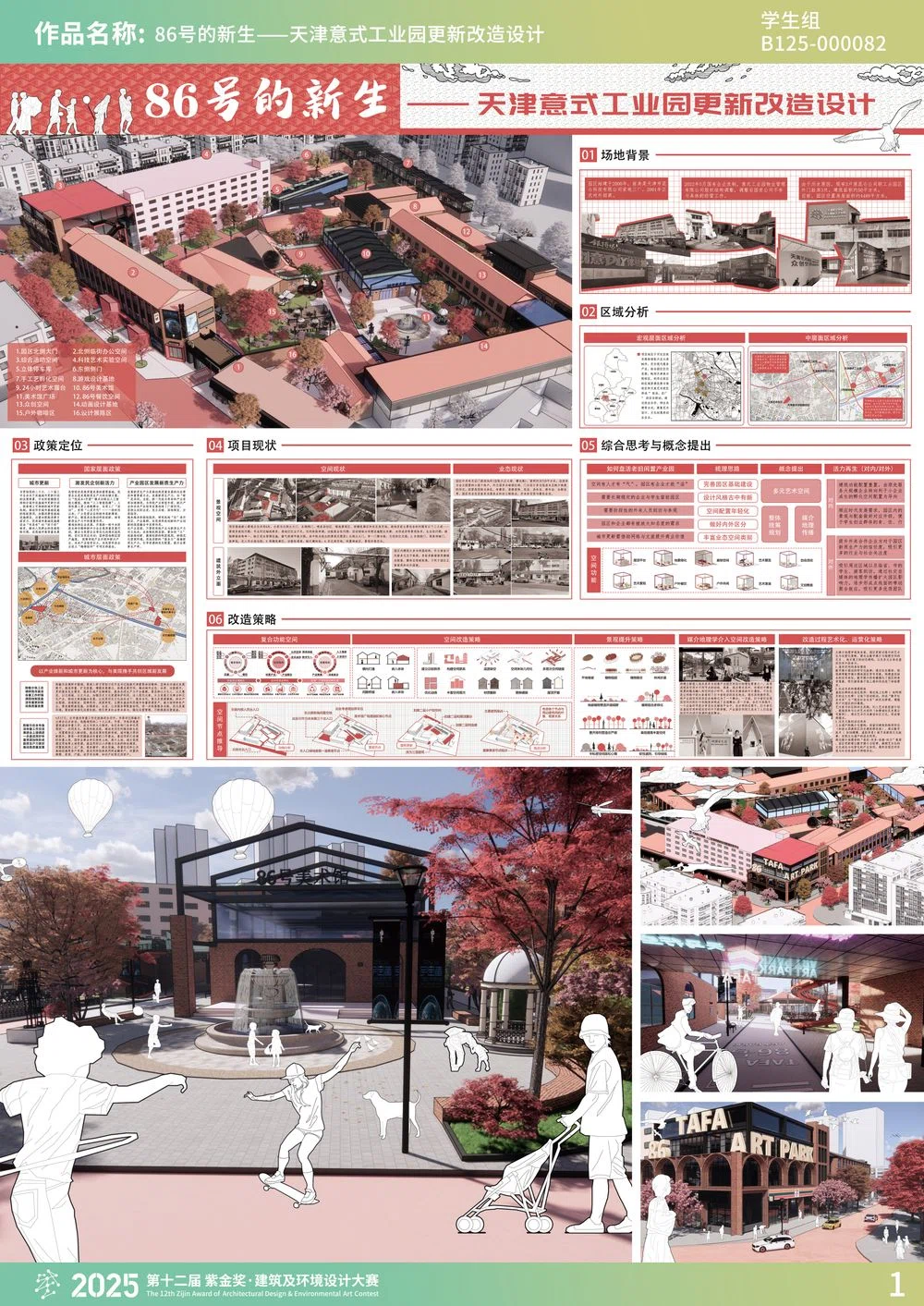 本作品围绕天津市河北区张兴庄大道86号产业园区展开设计,面对空间利用率低、业态混杂、文化认同缺失等问题,亟需通过城市更新实现产业升级与空间价值重构。本设计创新性地将媒介地理学理论与城市更新实践相结合,构建了"空间生产-媒介叙事-产业激活"三位一体的更新范式。
