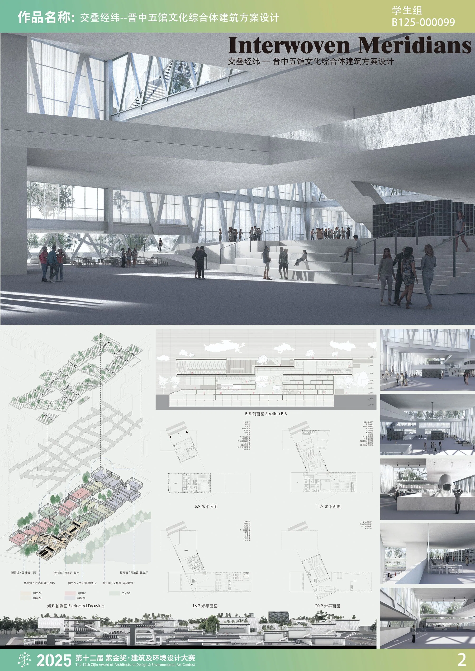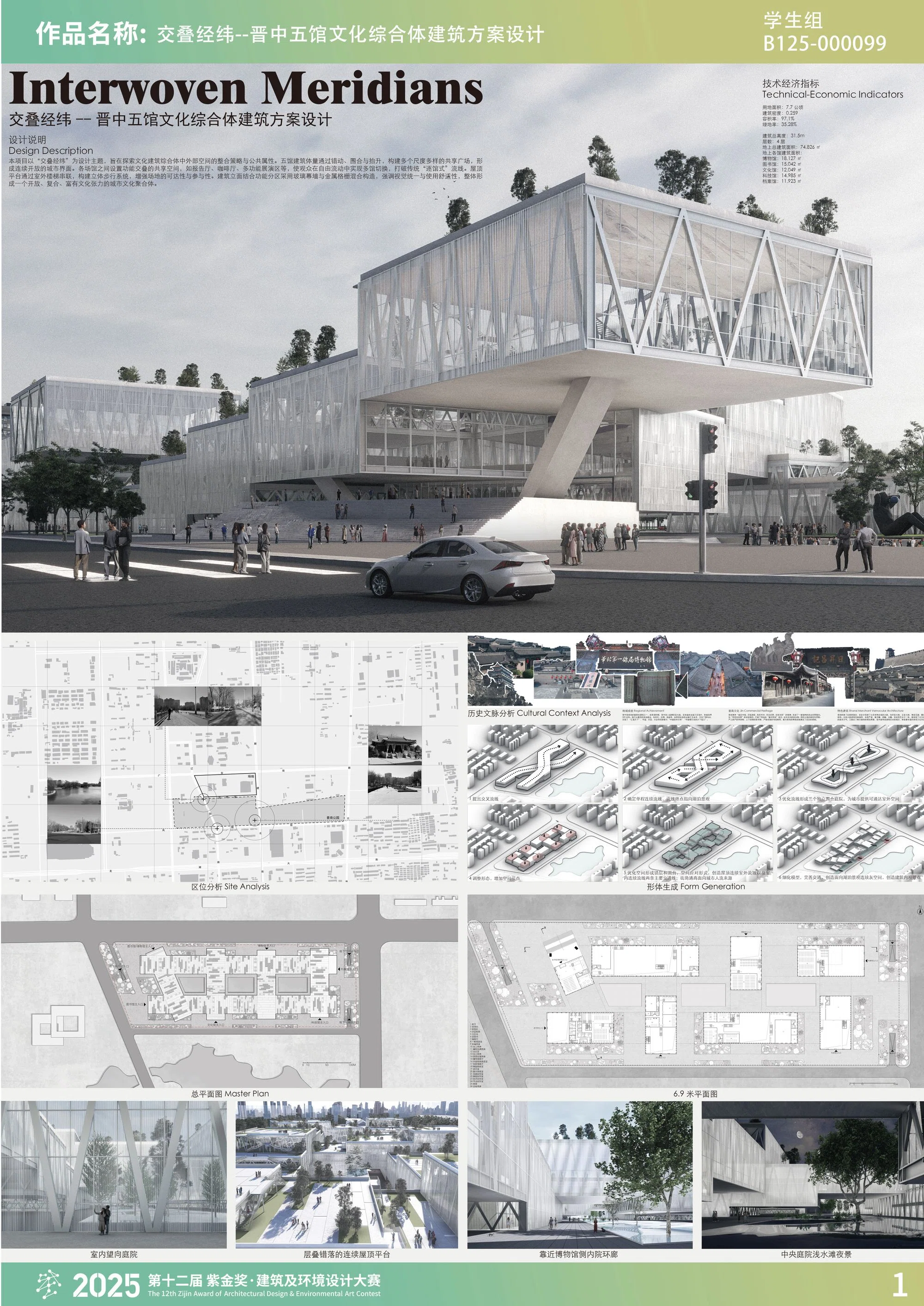 本项目以“交叠经纬”为设计主题,旨在探索文化建筑综合体中外部空间的整合策略与公共属性。五馆建筑体量通过错动、围合与抬升,构建多个尺度多样的共享广场,形成连续开放的城市界面。各场馆之间设置功能交叠的共享空间,如报告厅、咖啡厅、多功能展演区等,使观众在自由流动中实现多馆切换,打破传统“逐馆式”流线。屋顶平台通过室外楼梯串联,构建立体步行系统,增强场地的可达性与参与性。建筑立面结合功能分区采用玻璃幕墙与金属格栅混合构造,强调视觉统一与使用舒适性,整体形成一个开放、复合、富有文化张力的城市文化聚合体。