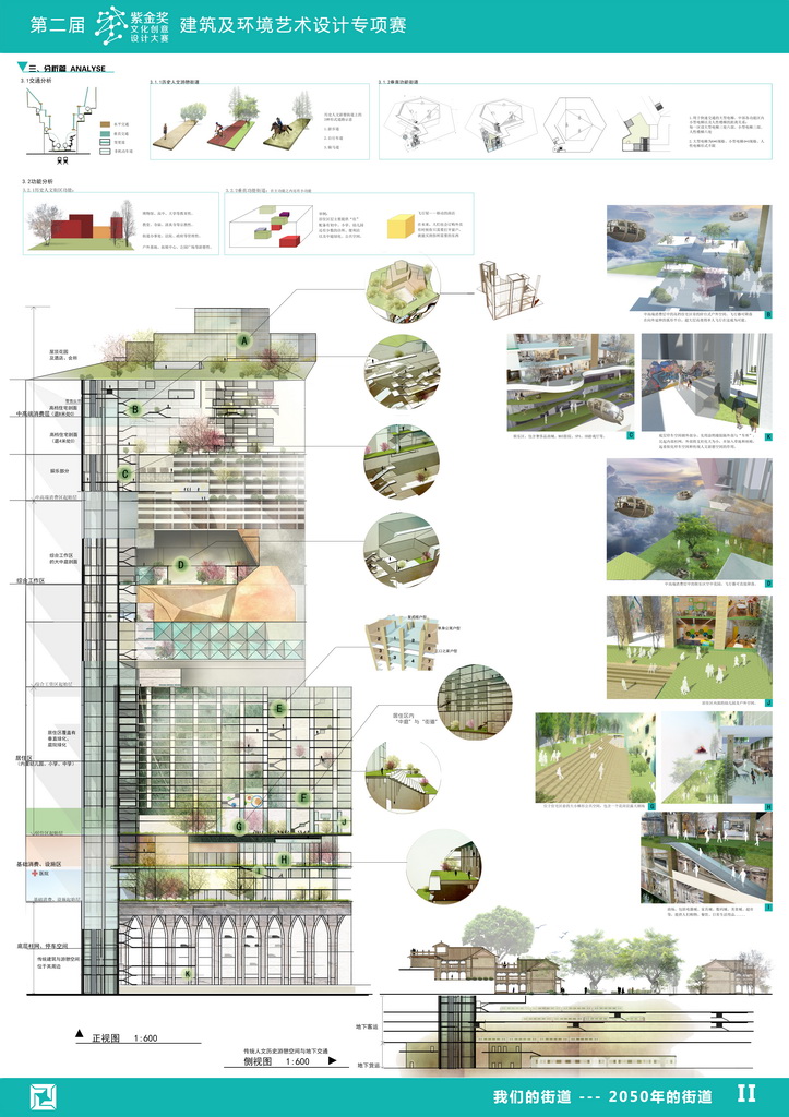 方案通过一条富有创意的垂直街道的设计,展现了对未来高密度城市“竖向性”公共空间的类型特征,组织结构,交通方式,及生态持续性的构想。方案设计呈现了富有前瞻性的视野和丰富的想象力,并以较具专业性的图式语言描绘与解析了未来城市复杂而系统的空间结构。