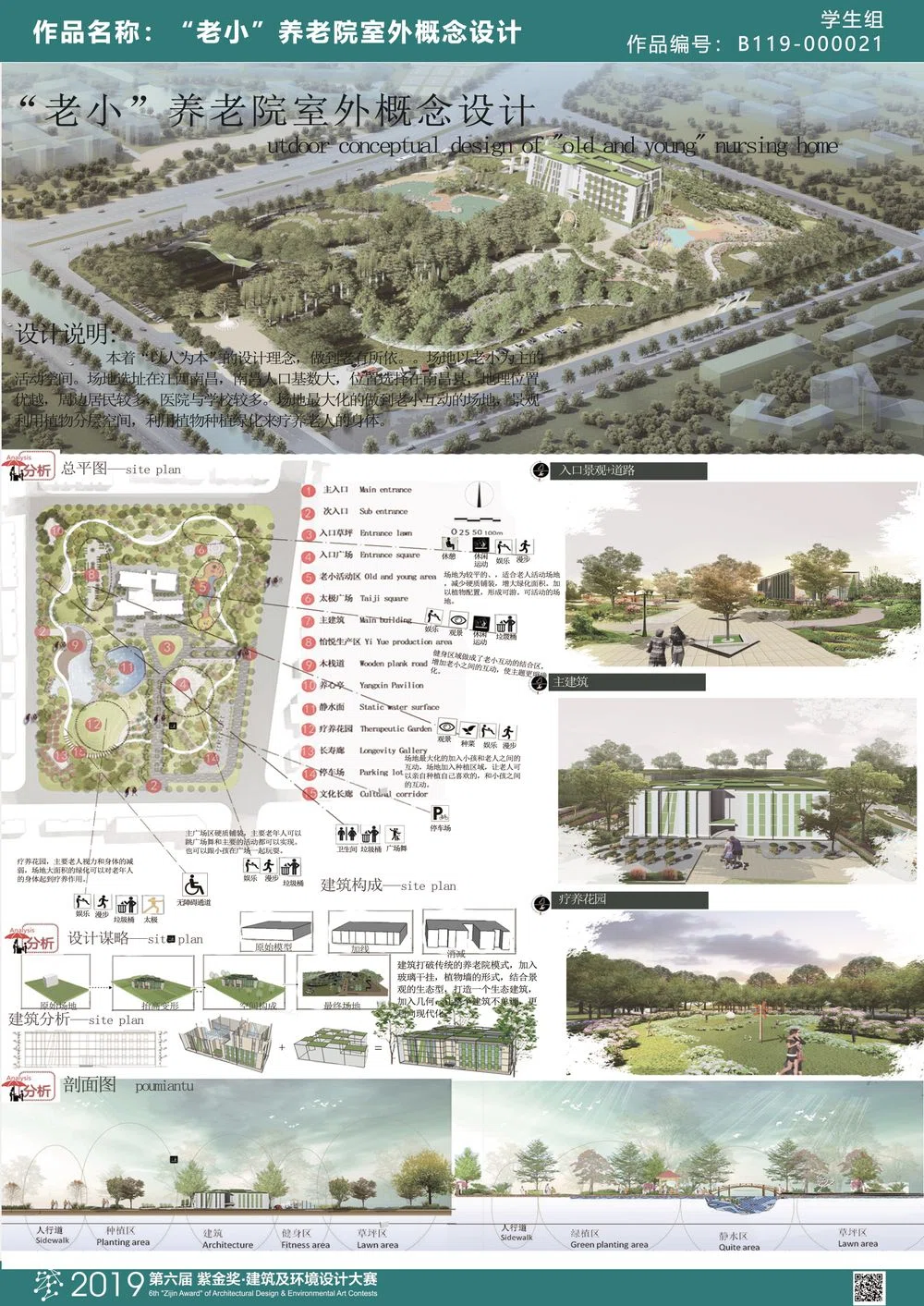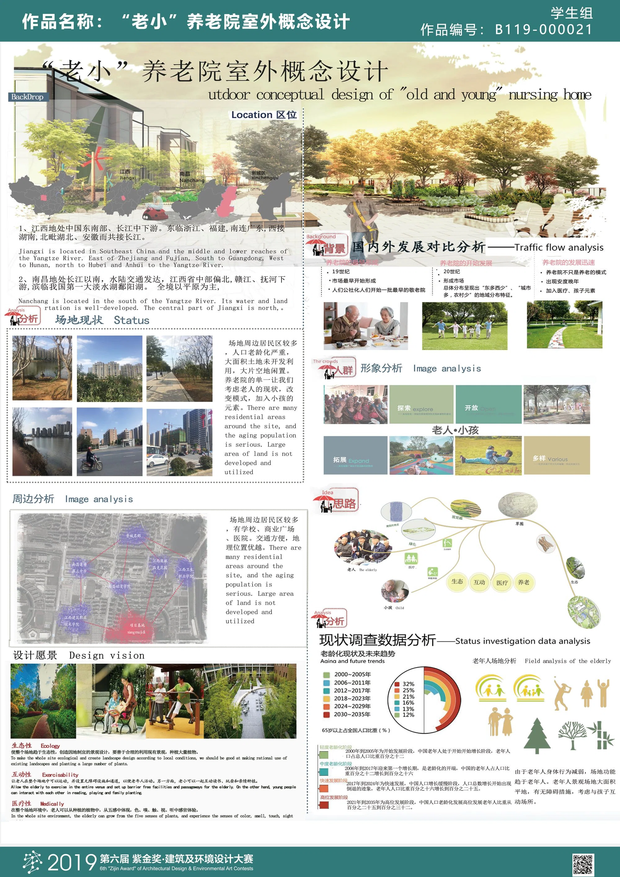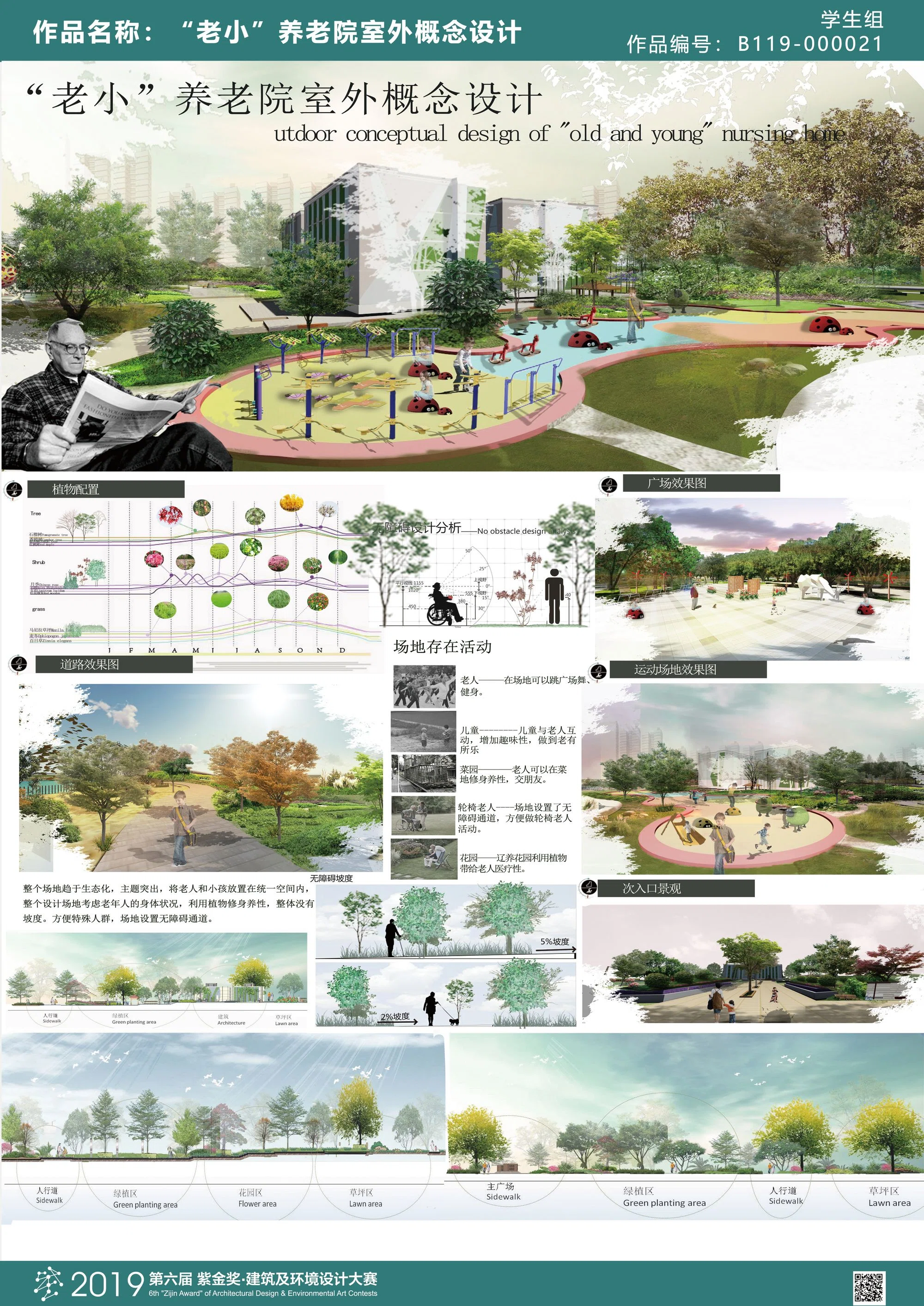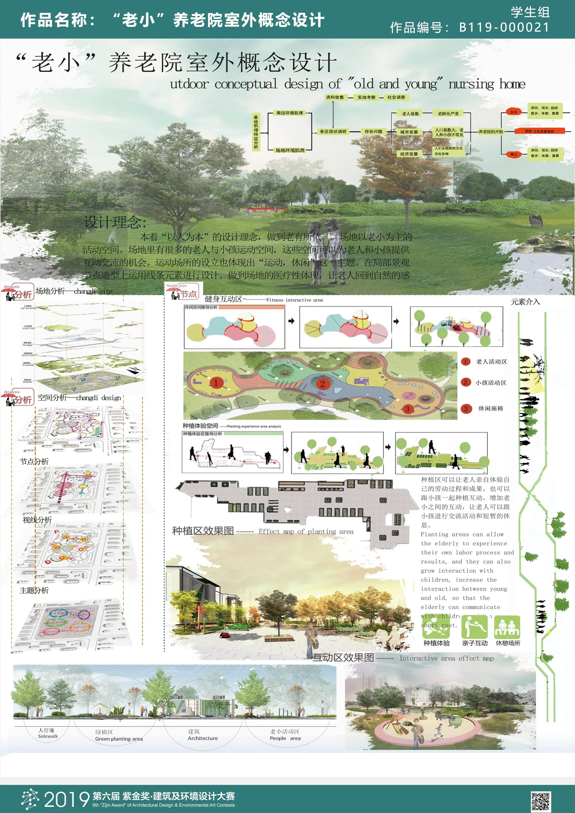 本着“以人为本”的设计理念,做到老有所依,场地以老小为主的活动空间。场地选址在江西南昌,南昌人口基数大,位置优越,周边居民较多,医院与学校较多,场地最大化的做到老小互动的场地,景观利用分层空间,利用职务的种植绿化来保护老人的身体。