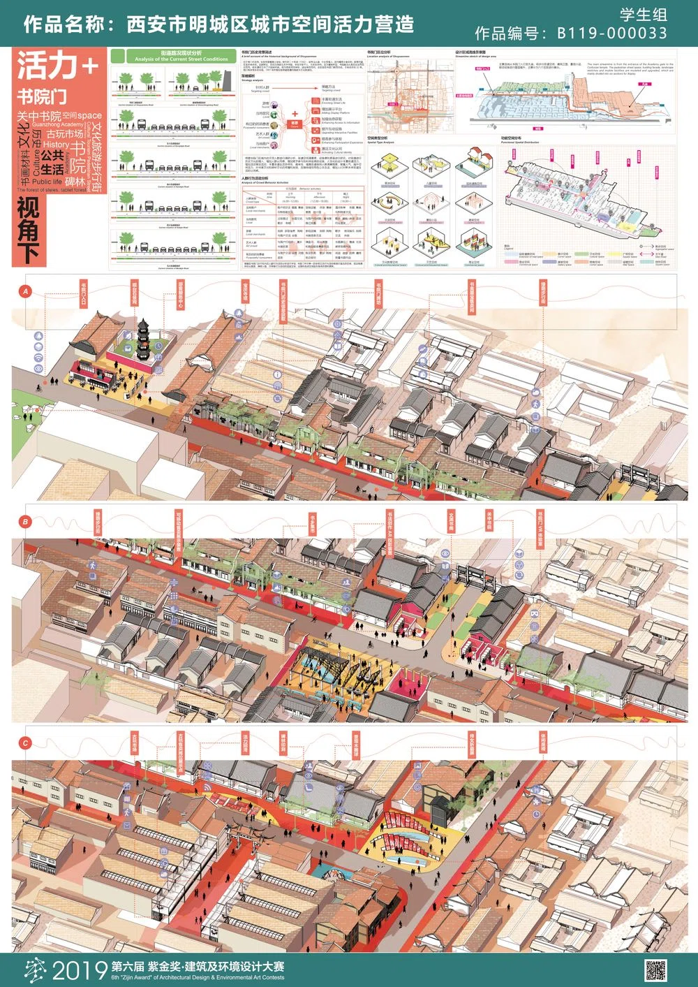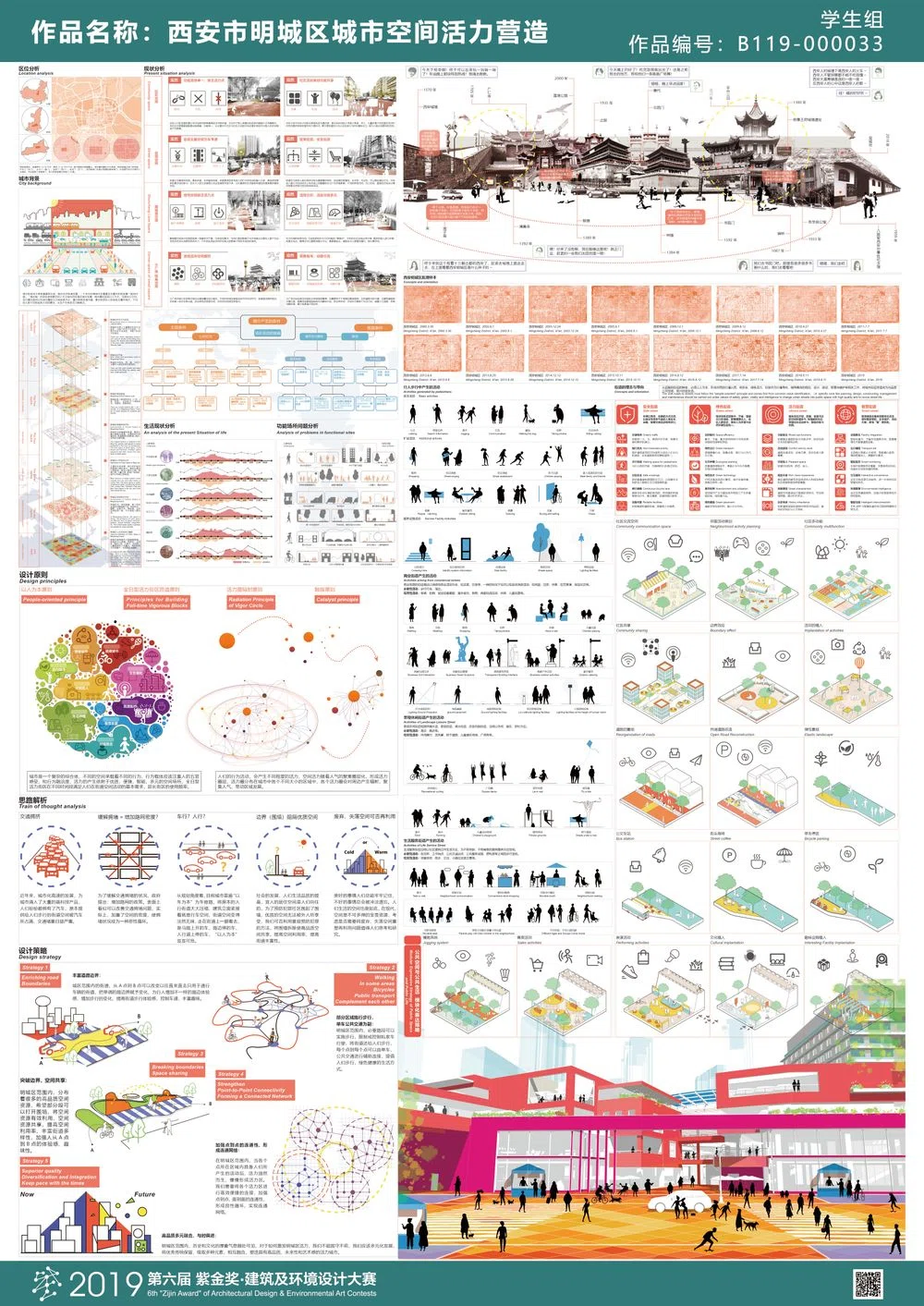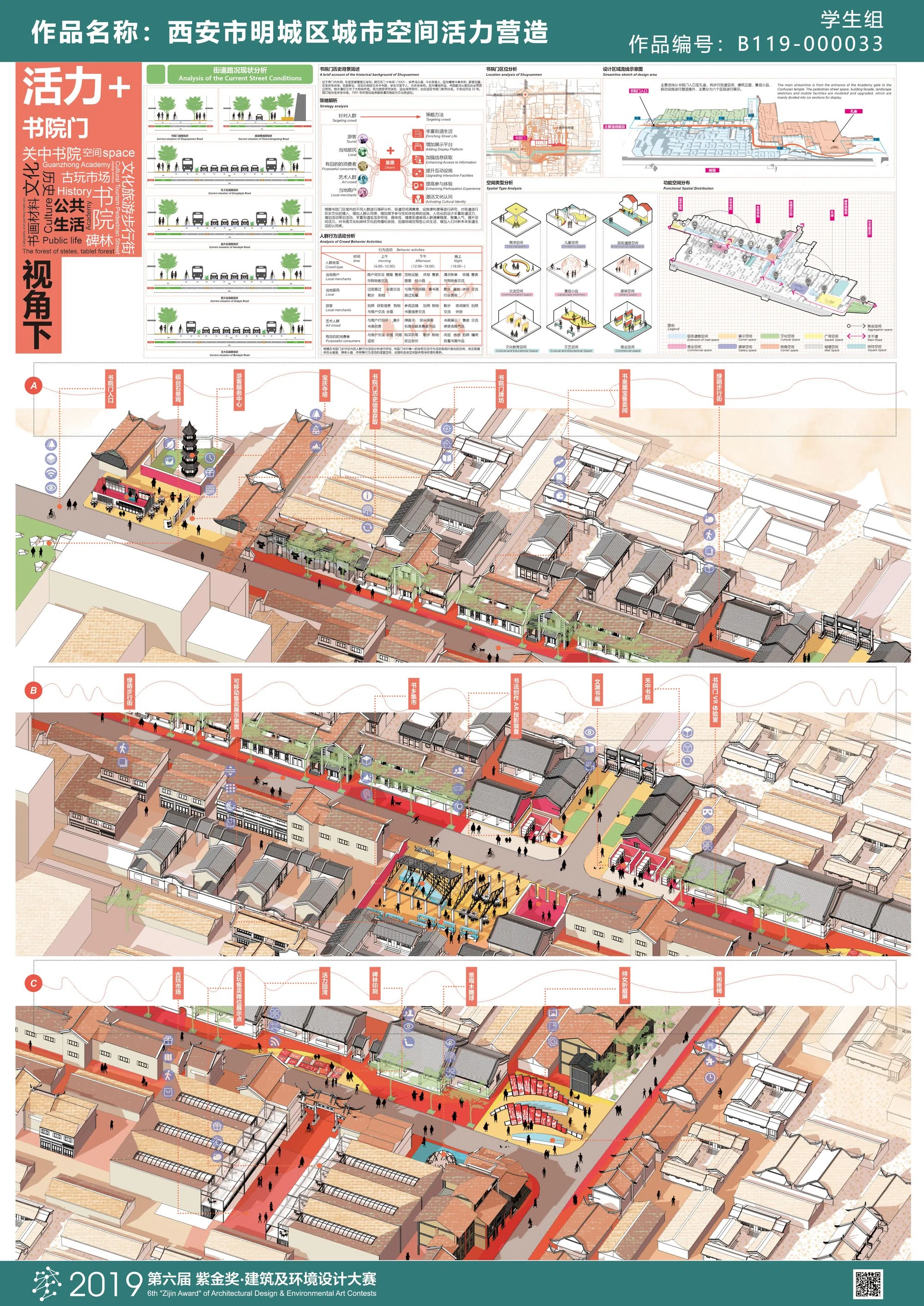 近年来,在我国城市更新理论引导下,西安市明城区进入新一轮城市更新阶段,本次课题以市民日常公共生活视角进行前期调研,具体围绕“明城区社区居民公共生活活动多样性调查分析、书院门历史街区改造、社区公共空间微更新以及城墙特色风貌区活力激活”等方面展开深入研究,通过城市设计的方法,并结合“古韵新作”的景观设计手法,旨在重塑的西安市明城区公共空间活力。