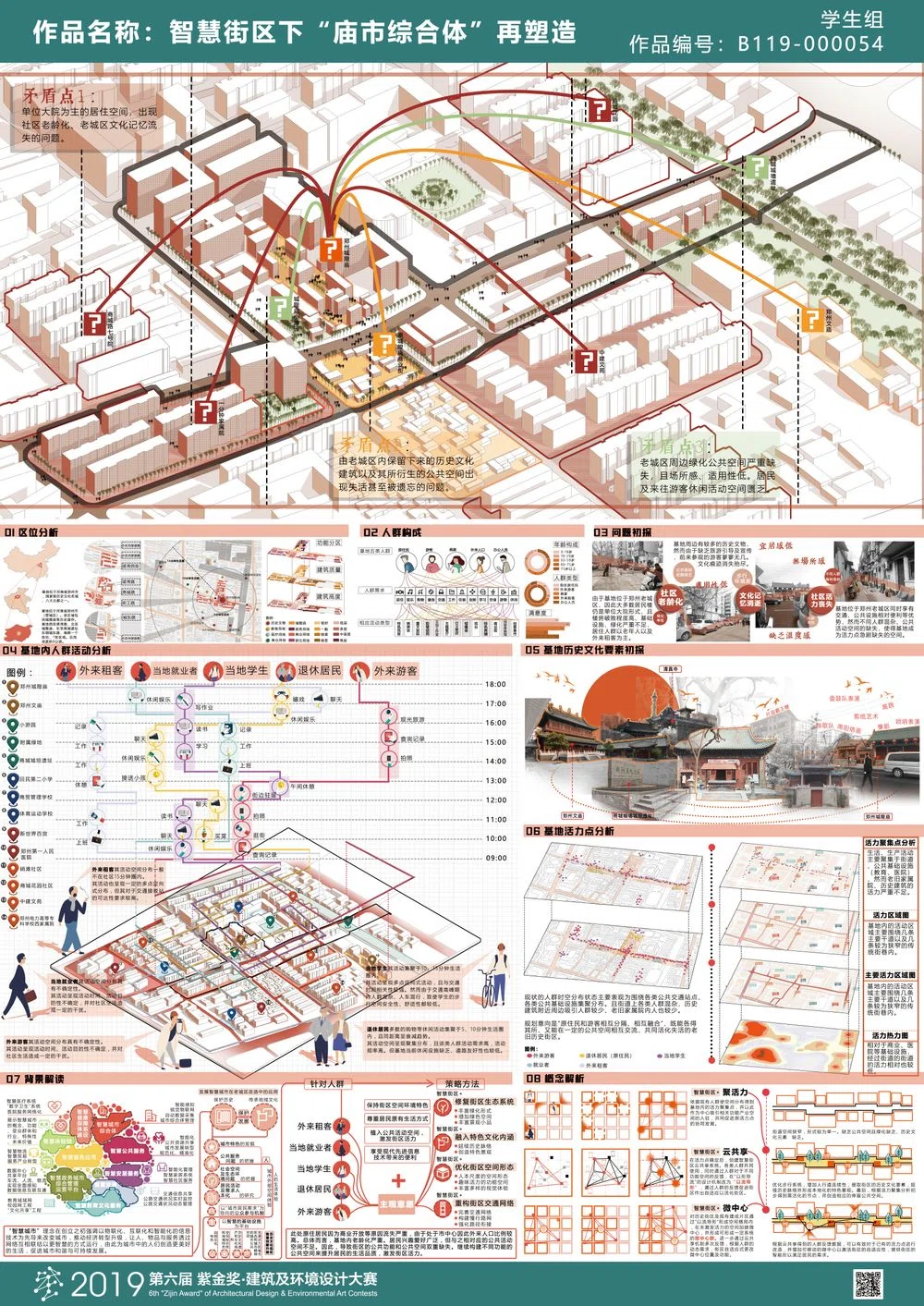 基地位于城市的老城区内,在拥有浓厚的民俗市井味道的城隍庙以及历经千年的城垣遗址的情况下,基地还是逃脱不了“宜居性”降低、“场所感”缺失等存量规划中的问题。经过现状梳理,发现基地存在三大矛盾点:①居住空间的社区老龄化、文化记忆流失。②历史文化建筑以及其所衍生的公共空间失活甚至被遗忘。③绿化公共空间严重缺失,且场所感、适用性低。