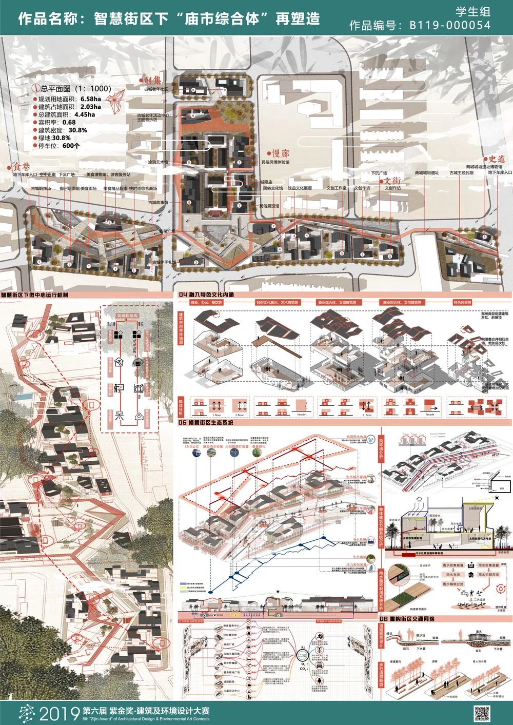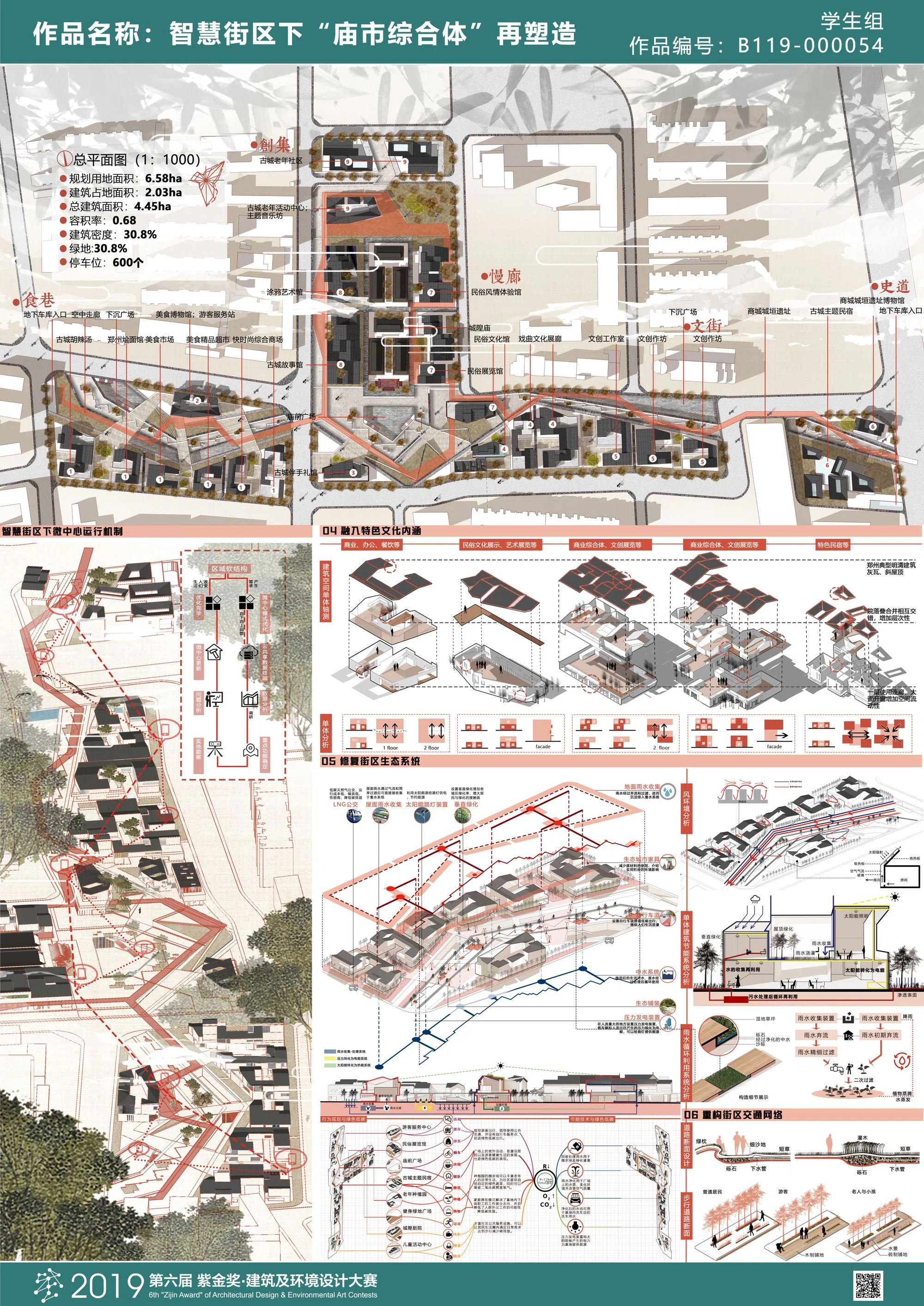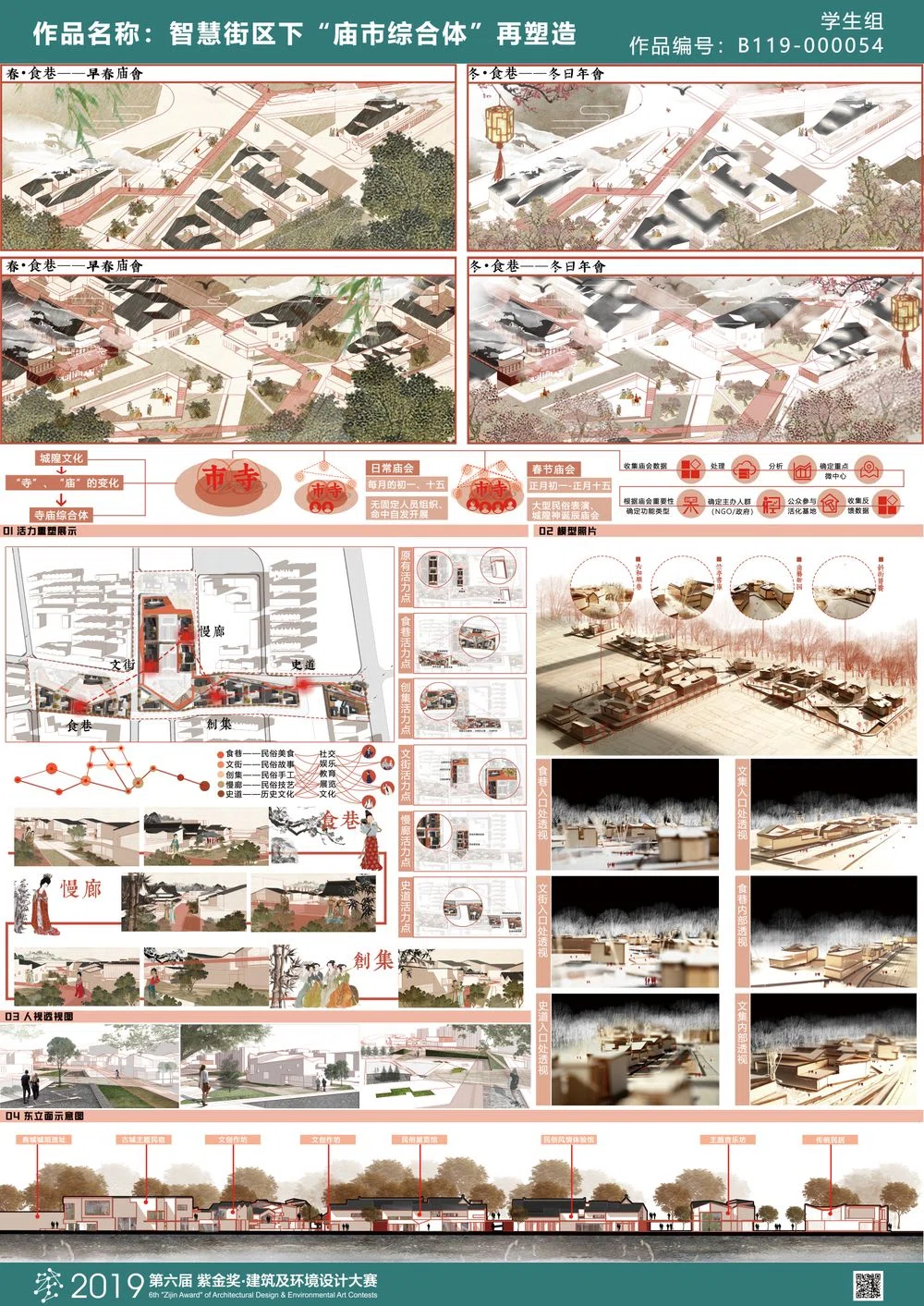 因此,本设计将通过智慧街区作为技术背景,通过打造“住民守望的多元文化聚集地,住民共享的智慧庙市结构体”作为目标,来实现“有温度、场所感”的宜居家园的建设。本方案通过云共享的方式首先“针灸式”地置入“食巷”、“文街”、“创集”、“慢廊”以及“史道”共同打造老城区的激活微中心。然而相对于“一次性规划”,本次设计以云共享系统为信息收集以及反馈机制的承载大数据系统,作为居民以及游客等群体的信息交互模式。通过本系统,微中心在初期作为改善居民、游客的生活生产以及娱乐的空间载体后,根据人群的反馈,为中心功能将通过居民参与的形式在时间的推移过程中发生改变,逐步适应人群的需求,以达到街区自适应的新型智慧街区系统。这种“以流导形”的方式将最终成为人群真实需求的空间完美载体。