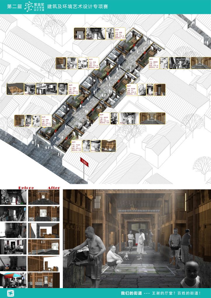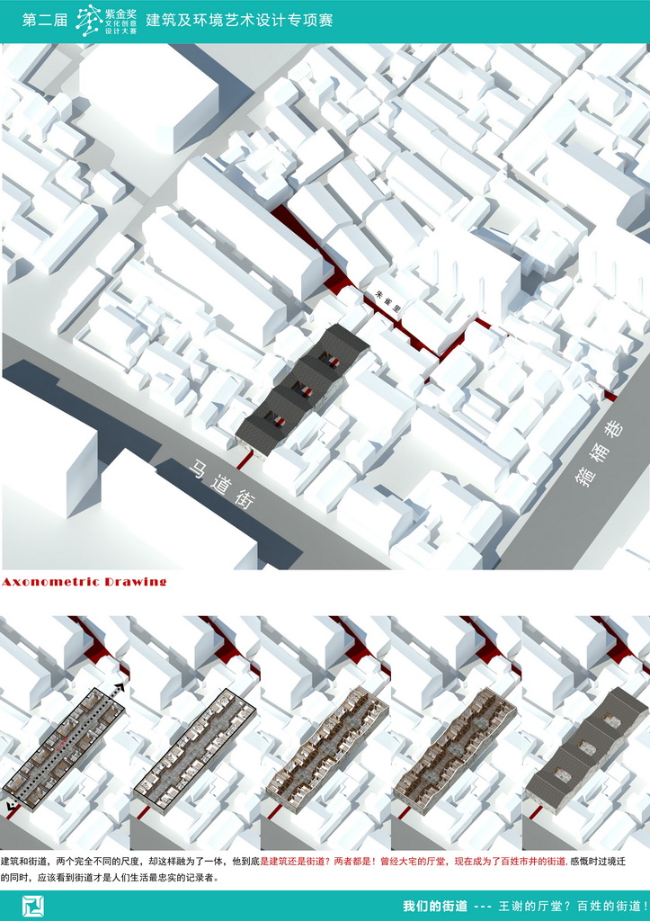该文案基于参赛者对城市特色空间的敏觉,在保护街区原有观赏性的基础上,通过对原有建筑的改造,改善了原居民的生活空间,塑造了南京城中这一极富特色的城市空间。