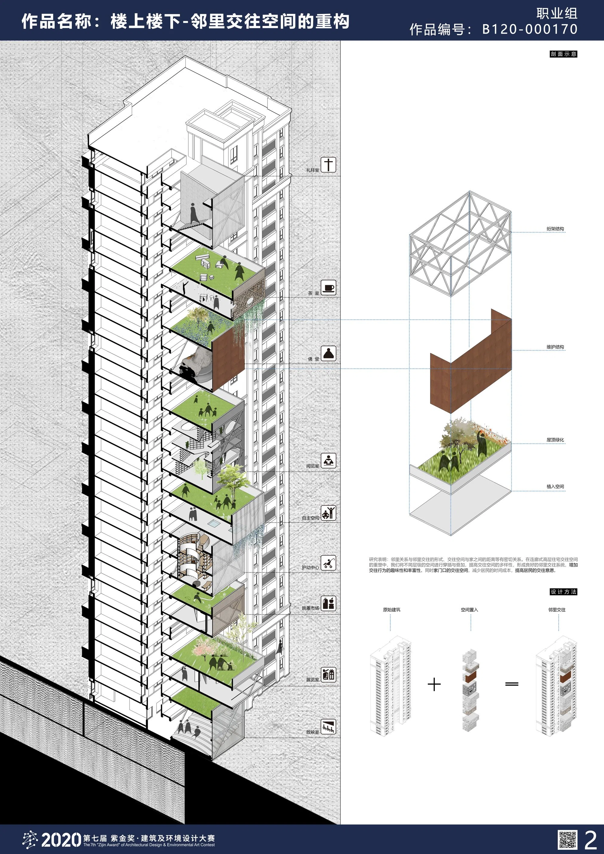 现代住宅中邻里交往空间的缺失是影响邻里关系的主要因素之一。该方案以连廊式高层住宅为切入点,在不太影响正常居住生活的连廊外则,通过不同层级的空间构架的穿插与叠加,置入多样可能性的公共交往空间,形成良好的邻里交往系统,达到重塑邻里关系的目的。这既是对健康生活空间的大胆补充,也是对当下商业地产效益至上模式的反思。在新冠疫情背景下,该设计师能深入思考当代居住环境中淡漠的邻里关系所存在的问题,并创新性地提出有效的改进措施与设计策略,是具有现实意义和值得肯定的。