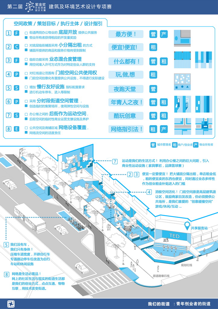 本设计从特定人群的特点和需求出发,通过制定一系列空间政策,对应设计指引,将城市管理者、产权所有者和创业者等各方联系起来,希望通过引导充分发挥市场的力量,改造再造适合创业与创业者的街道空间与活动。
