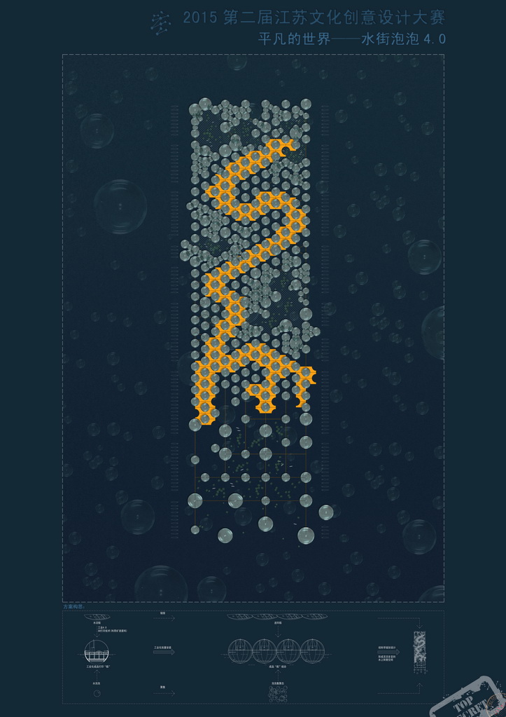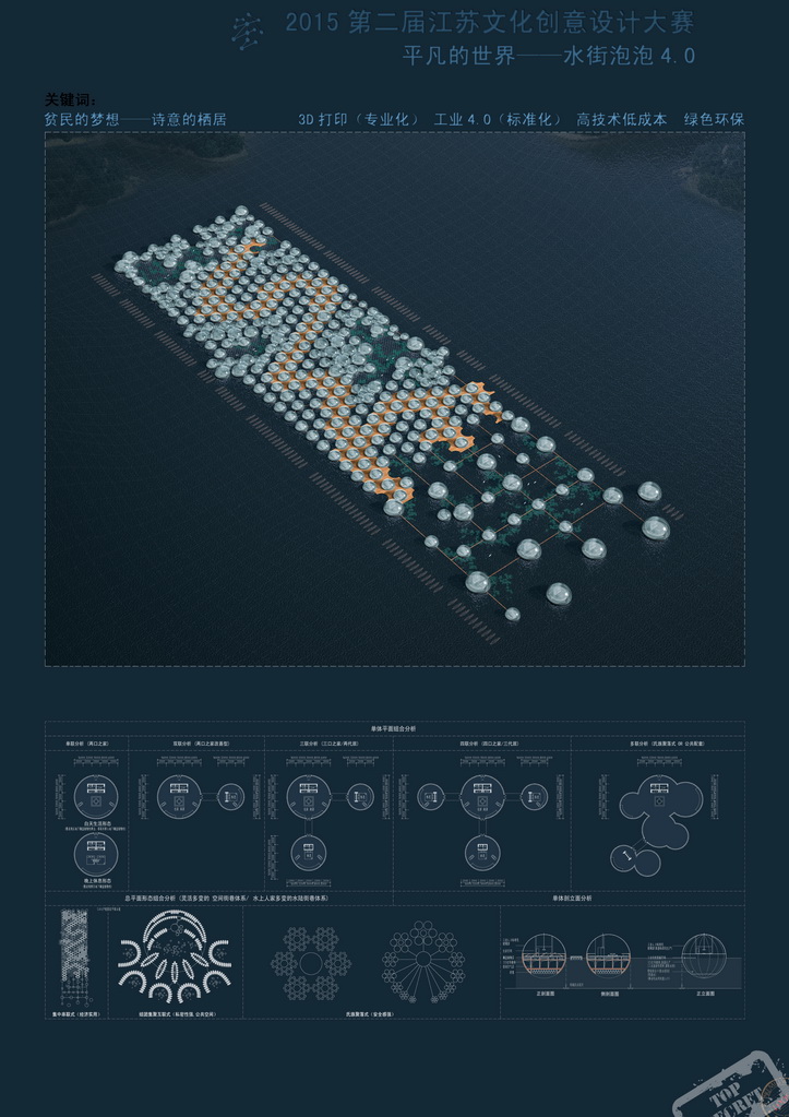 该设计以建设新型水上船家村落为入脚点,以单元式工业化“3D打印”技术制造的“泡泡”为切入点,在理念上既体现整体性和一定的灵活型,又体现水上船家的生活特色,有特色和创意。