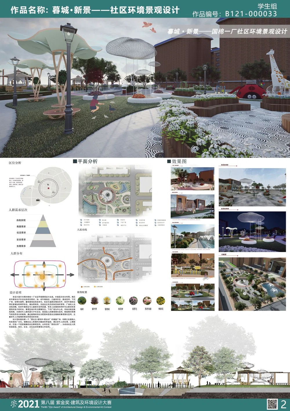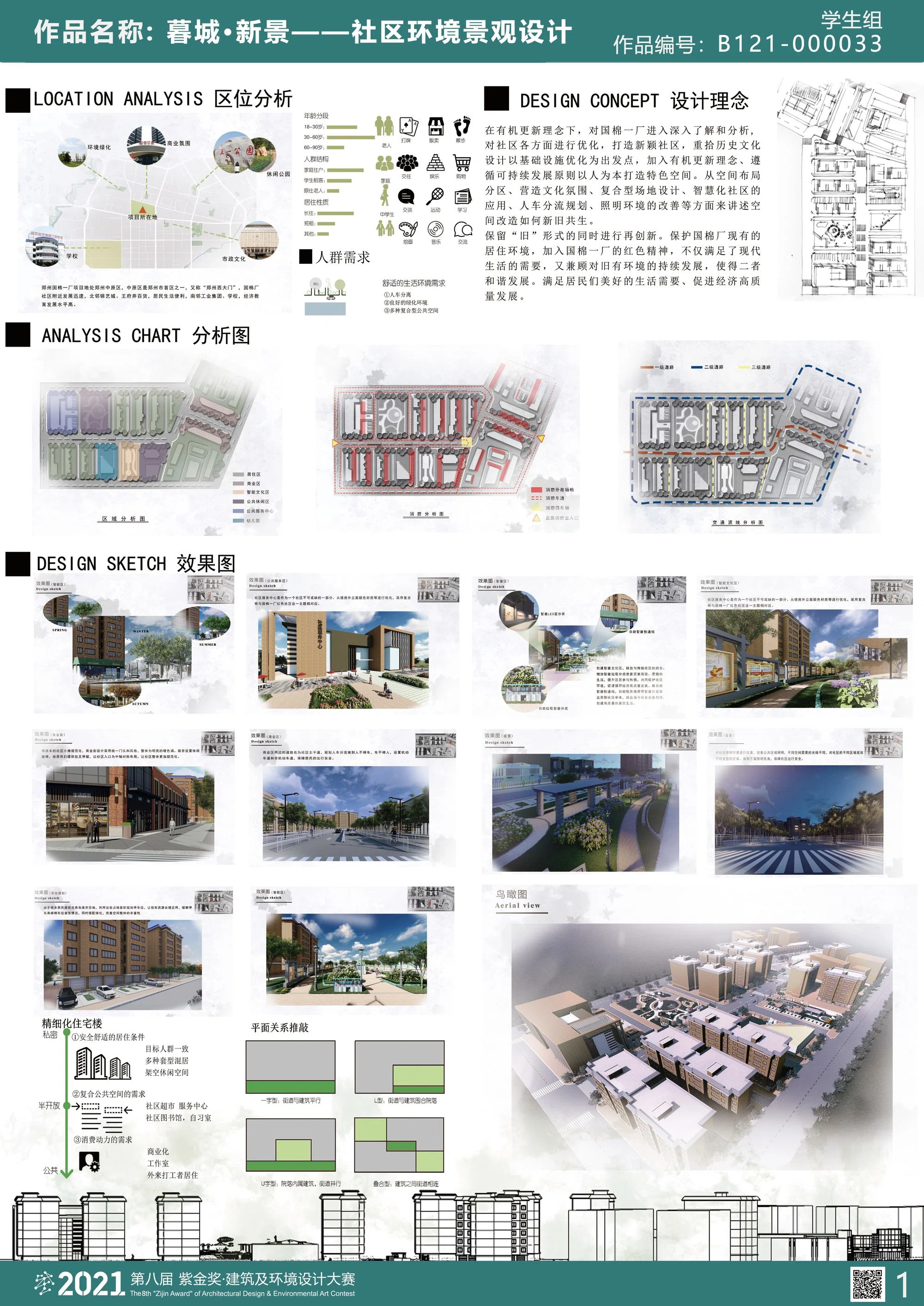 本设计是针对郑州棉纺一厂社区环境景观设计改造,在有机更新理念下,对国棉一厂进入深入了解和分析,对社区各方面进行优化,打造新颖社区,重拾历史文化。设计以基础设施优化为出发点,加入有机更新理念、遵循可持续发展原则以人为本打造特色空间。从空间布局分区、营造文化氛围、复合型场地设计、智慧化社区的应用、人车分流规划、照明环境的改善等方面来讲述空间改造如何新旧共生。丰富层次优化布局,满足老年群体对户外活动多样性需求,如:老年健身区、儿童游乐区、晨读空间、下沉广场、宠物乐园等。重视基础设施适老化,如近水道路边增加栏杆、在老年健身区等位置增加轮椅停车位,增加照明系,沿途设立充足的休息场所等等。设计目标是创建一个“爱社交+爱陪伴+爱运动”的健康广场。创新之处是融入特色棉纺厂融入特色棉纺厂文化,增强社区人民强烈归属感和幸福感。满足老年人的生理、心理需求,打造一个宜居健康的社区景观空间,从而实“原居安养”。为老旧社区人民创造宜居、快乐、安全、交往友好的景观公共空间。在保留“旧”形式的同时进行再创新。保护国棉厂现有的居住环境,加入国棉一厂的红色精神,不仅满足了现代生活的需要,又兼顾对旧有环境的持续发展。