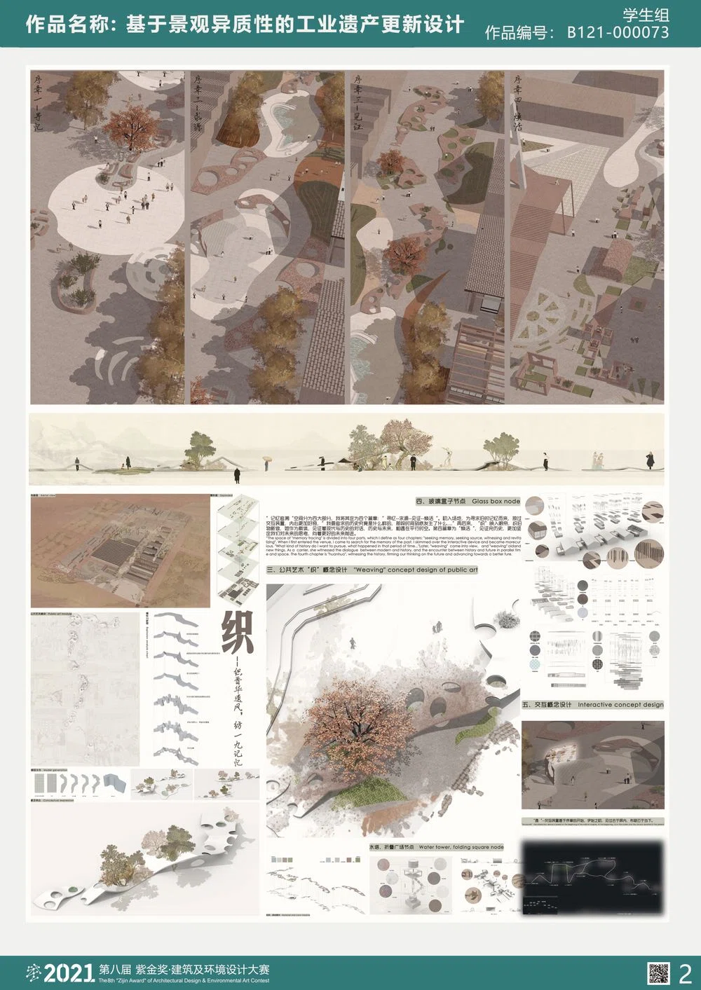 设计从纺织工艺入手,通过对纺纱过程中化学反应产生的物质交换与转变的深入了解,提出“异质性”,即在一个整体中各类元素发生变化但整体不变。在景观中,异质性通过取舍工业遗存、干预有序空间序列、修饰改造形态、丰富空间层次等手法来对基地产生相应影响,并保持整个景观系统统一。
