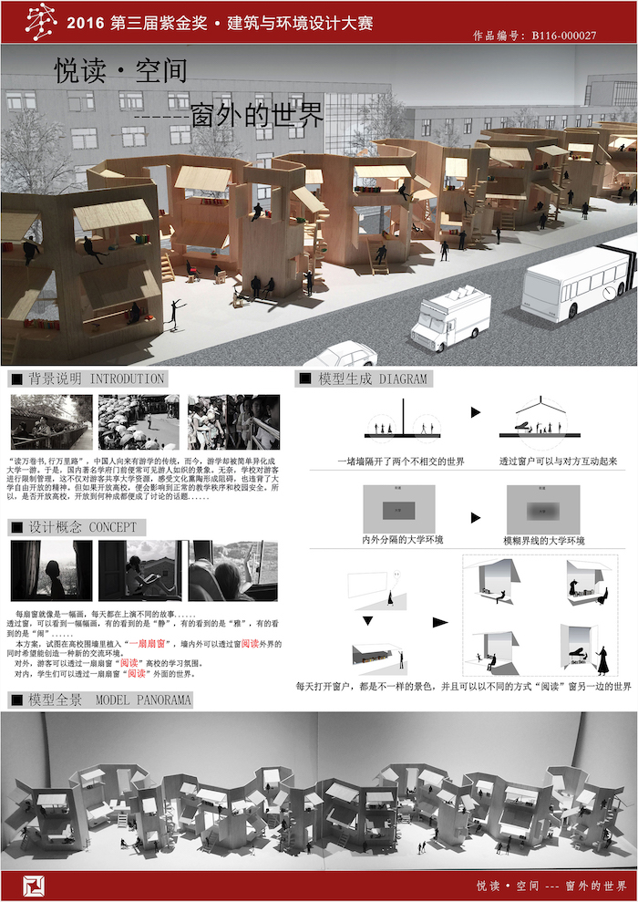 本方案试图对高校围墙内植入“一扇扇窗”,墙内外可以透过窗阅读外界的同时,希望能创造一种新的交流环境。