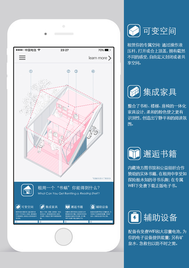 通过手机app搜索附近的书蜗,即用即租,用app操作屋顶开合,带来开放和封闭两种空间体验。内部家具集合多种功能,粉色使其更具标志性,也带来平静的氛围。除去实体书,书蜗亦与各大文库合作,在建筑附近可以通过WIFI免费获得正版电子书。